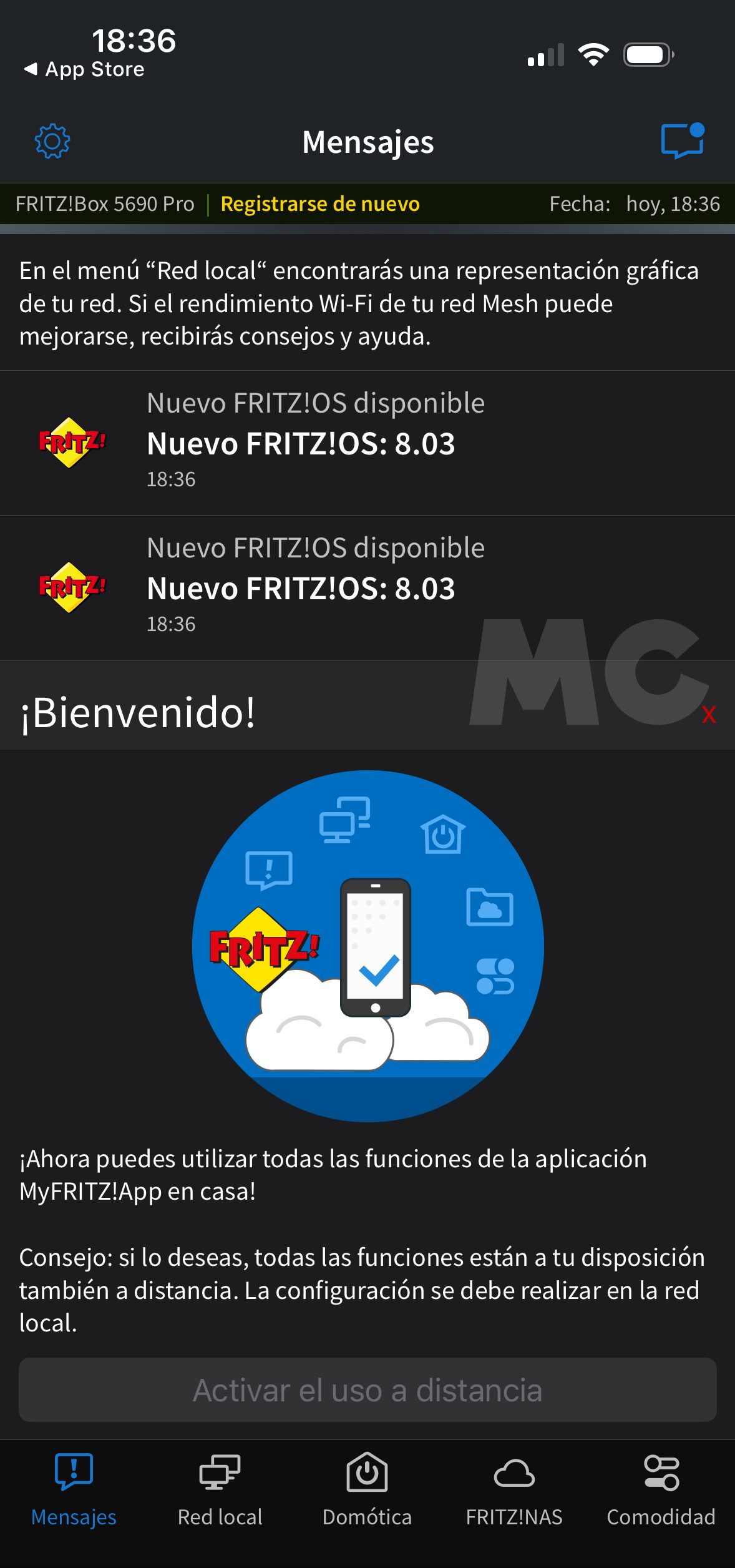 La aplicación FRITZ!App Wi-Fi también es muy útil, ya que nos permite hacer mediciones de rendimiento y latencia, acceder al FRITZ!Box 5690 Pro a distancia, ver la red a la que estamos conectados, crear acceso para invitados y comprobar la intensidad con la que recibimos la señal de nuestra red Wi-Fi, entre otras cosas.