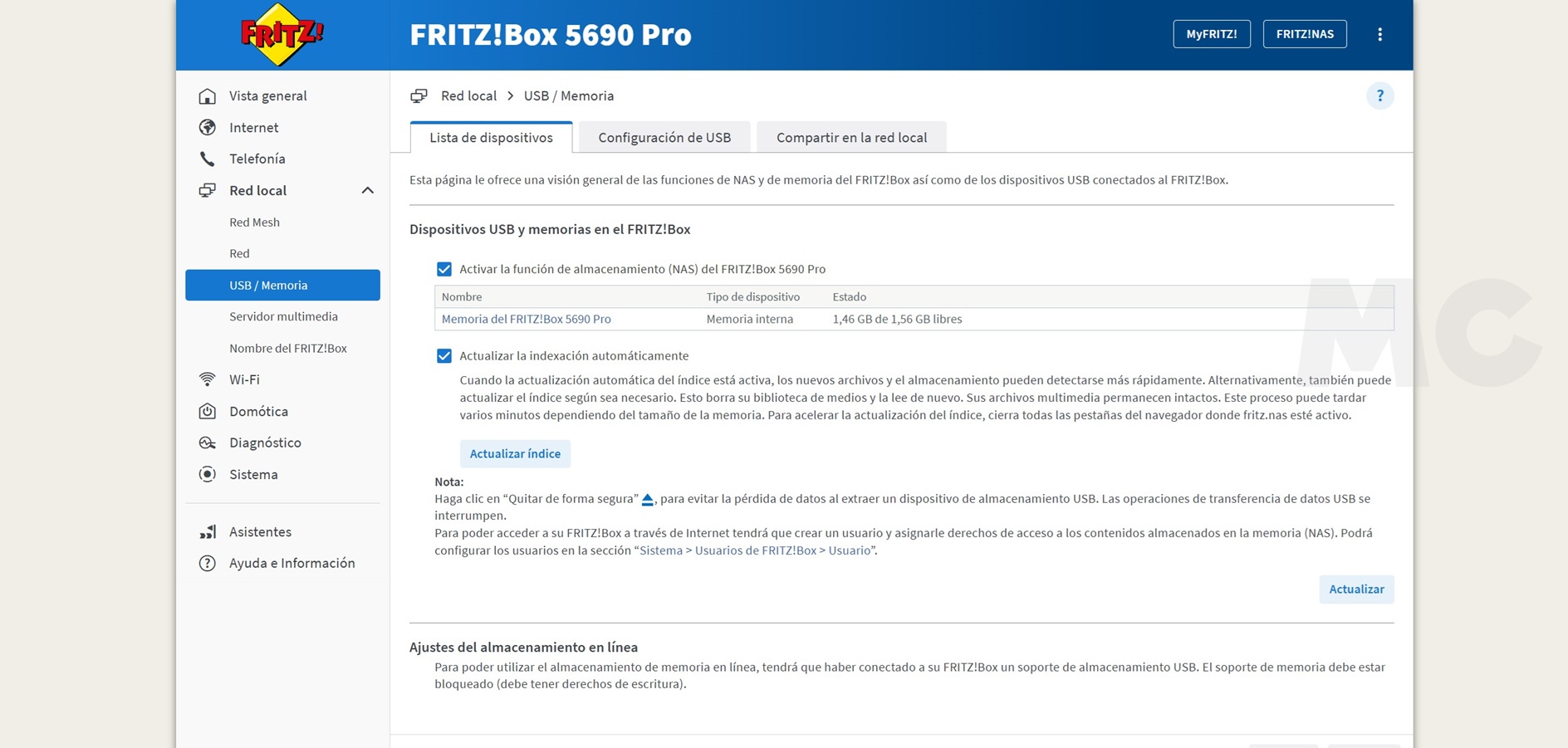 En la sección de red local podremos ver la configuración de nuestra red mallada y otros ajustes importantes. El FRITZ!Box 5690 Pro hace un uso impecable de los dispositivos conectados en red mallada una configuración que hace que todas las soluciones de red que tenemos conectados al router, como repetidores Wi-Fi, se comporten como si formasen una única red.