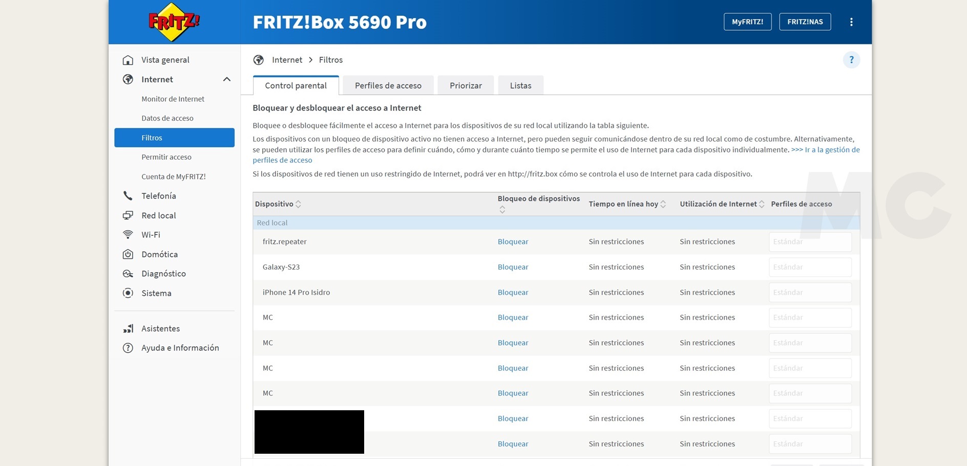 Con el FRITZ!Box 5690 Pro ganamos en funciones y en tecnologías, y es que este router lo tiene todo: Wi-Fi 7, telefonía DECT y analógica, fax, contestador, domótica, NAS, seguridad avanzada con control parental y limitación de acceso a Internet, tanto por tiempo como por contenidos y direcciones, y mucho más, pero también ganamos a nivel de interfaz.
