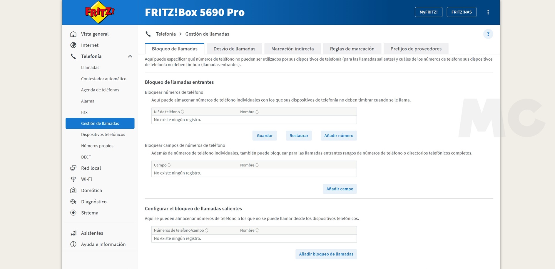 Además de todo lo relacionado con Internet, redes y Wi-Fi, el FRITZ!Box 5690 Pro también ofrece diferentes opciones de configuración dedicados a telefonía, domótica y almacenamiento. Podemos establecer diferentes opciones de llamada, fijar cinco contestadores distintos, crear opciones de marcación rápida, vincular hasta seis teléfonos DECT y acceder a la función de fax.