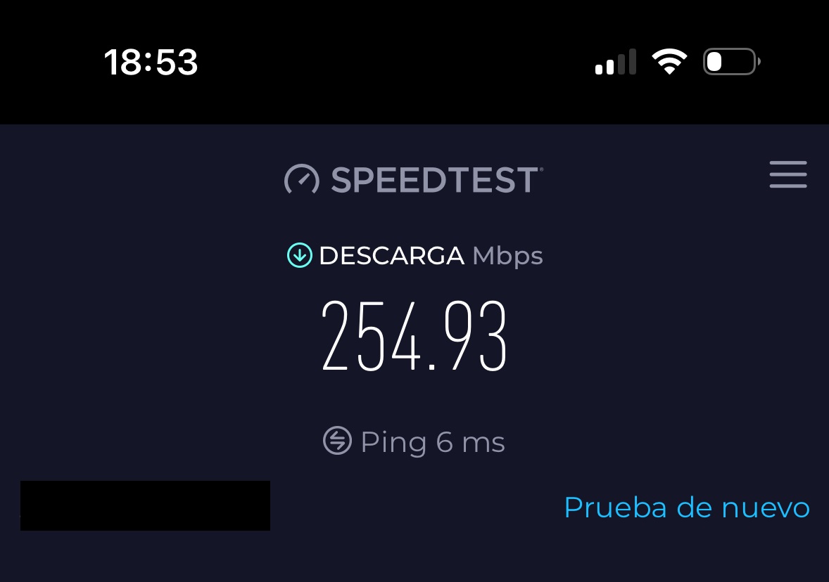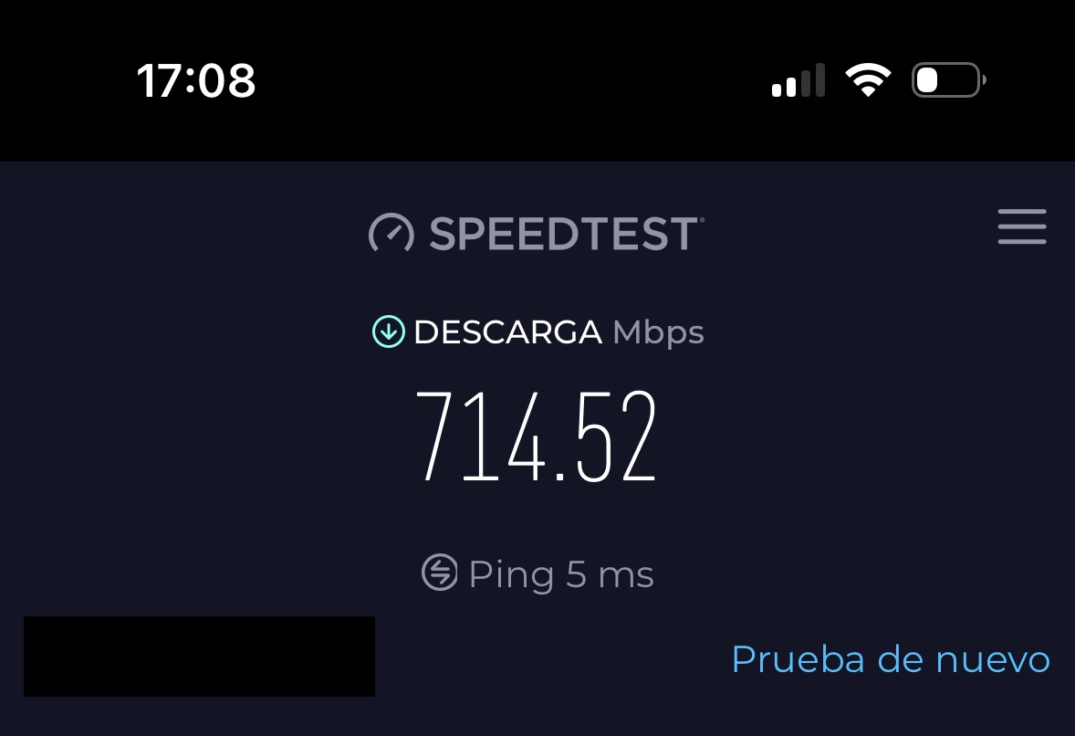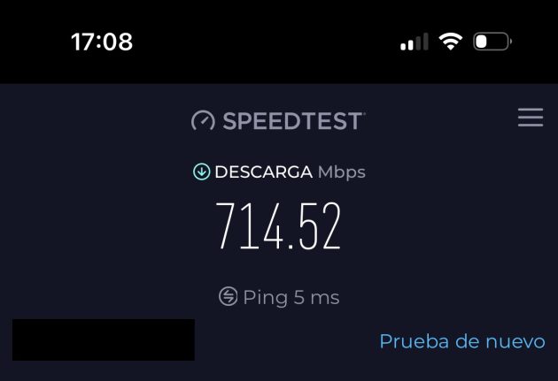 Utilizando una conexión a Internet de fibra de 900 Mbps obtuve, con un iPhone 14 Pro, más de 700 Mbps de velocidad de bajada cerca del router, y entre 400 y 500 Mbps en el salón, que es una zona que esta a una distancia media del router. En el punto más alejado, que es la habitación principal, la velocidad se mantiene en unos 250 Mbps, ambos en la banda de 5 GHz.