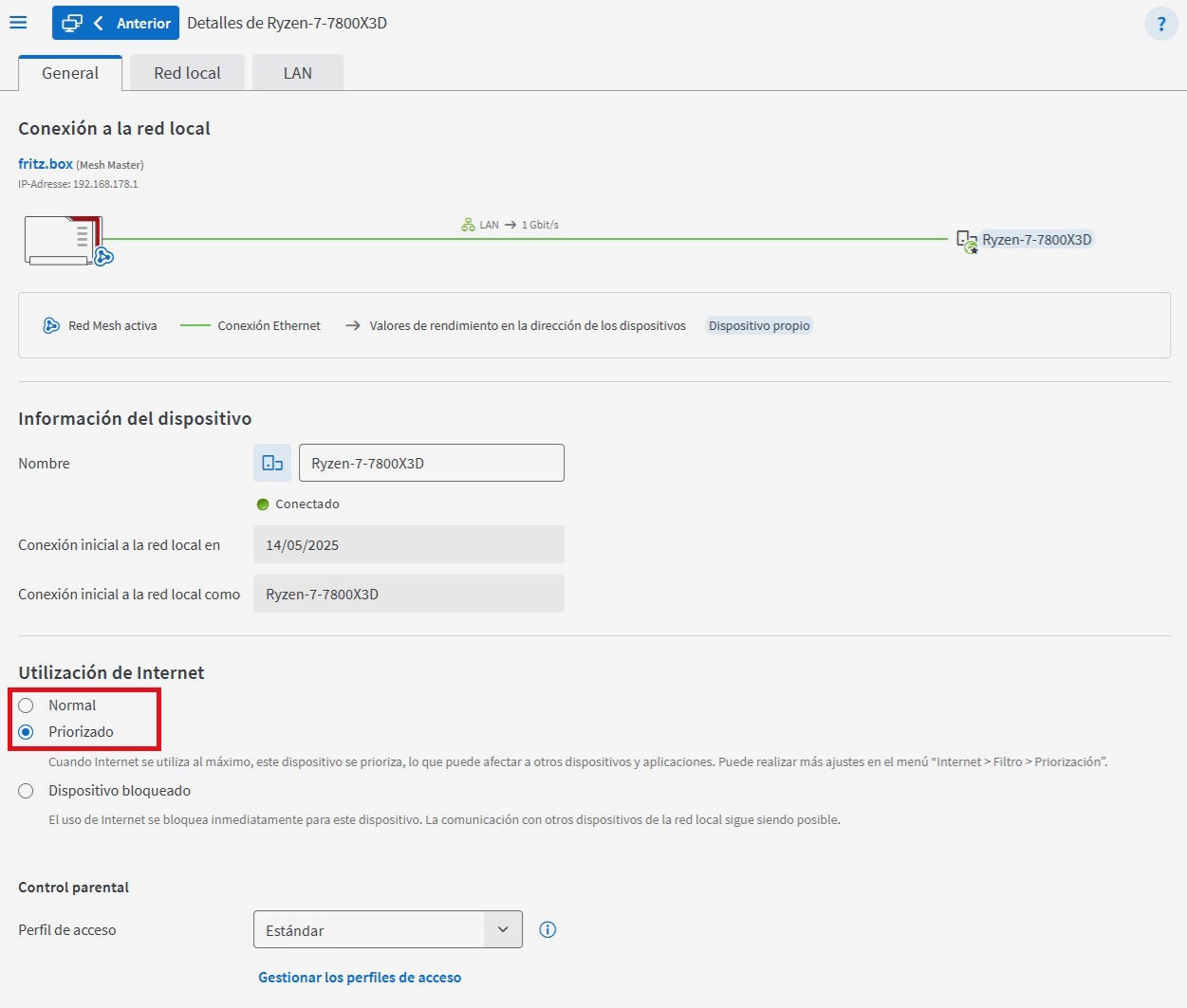 • Ahora solo tienes que hacer clic en «Priorizado», dentro de la sección de «Utilización de Internet».