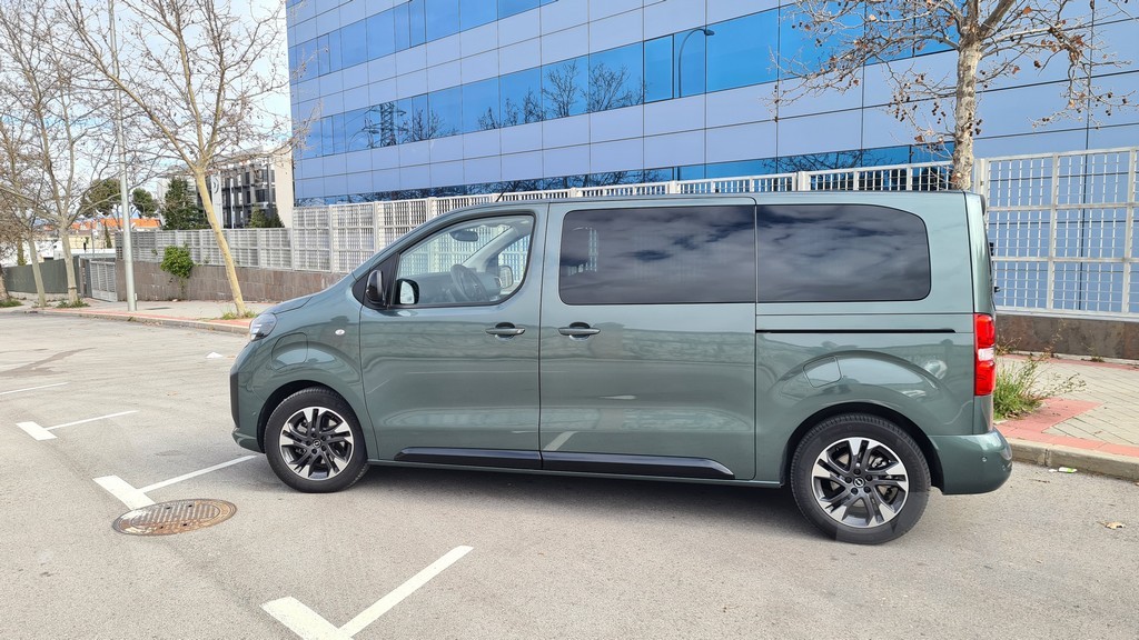 Ya tuvimos la ocasión de probar el Zafira de la anterior generación, pero se han actualizado diversos detalles. Al observar su perfil, la herencia del modelo comercial Vivaro es innegable. La silueta es inevitablemente regular, con líneas rectas y superficies planas diseñadas para optimizar el volumen interior. Está disponible en dos longitudes de carrocería, permitiendo adaptarse a distintas necesidades de espacio. Las grandes puertas correderas laterales, que pueden ser eléctricas en los acabados superiores, garantizan un acceso cómodo y amplio a las plazas traseras. La comparación de tamaño con su antecesor es reveladora del cambio de concepto. La versión L del Zafira-e mide 5.305 mm de largo, 1.920 mm de ancho y 1.890 mm de alto, mientras que el Zafira Tourer de 2017 se conformaba con 4.666 mm de largo, 1.928 mm de ancho y 1.660 mm de alto. Esta generación es pues más de 60 cm más largo y casi 30 cm más alto, una diferencia abismal que evidencia el paso de un monovolumen a un vehículo derivado de comercial. Las llantas de cinco radios son un toque de diseño algo más sofisticado y elegante que contrastan con la estética cuadriculada del perfil del coche.