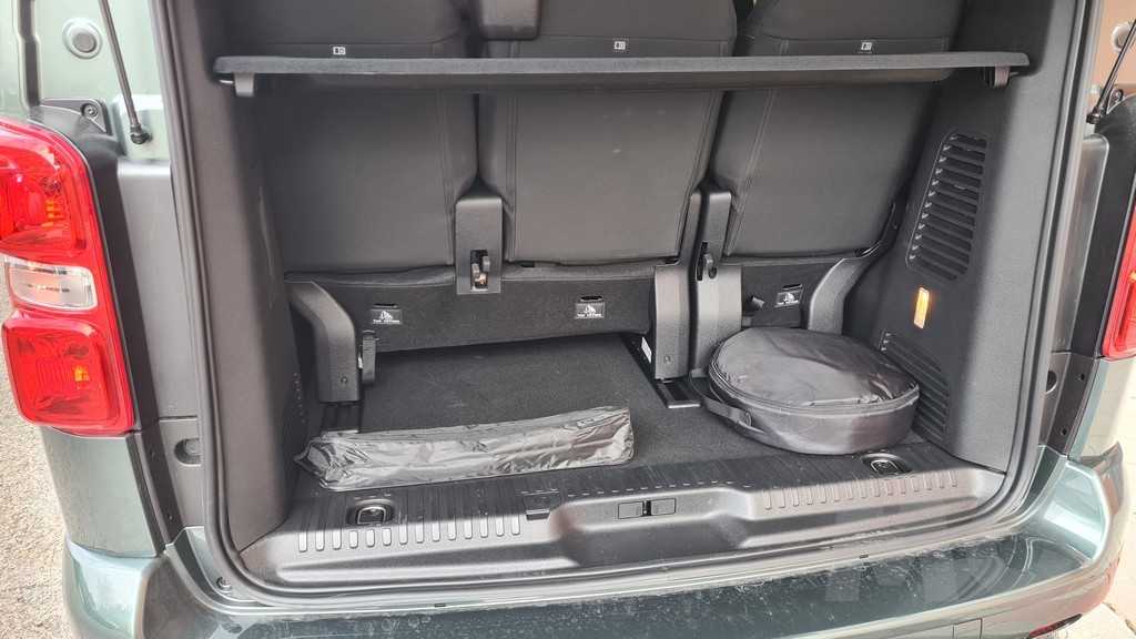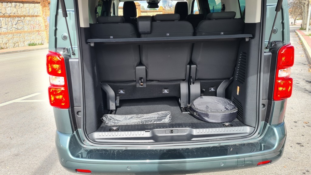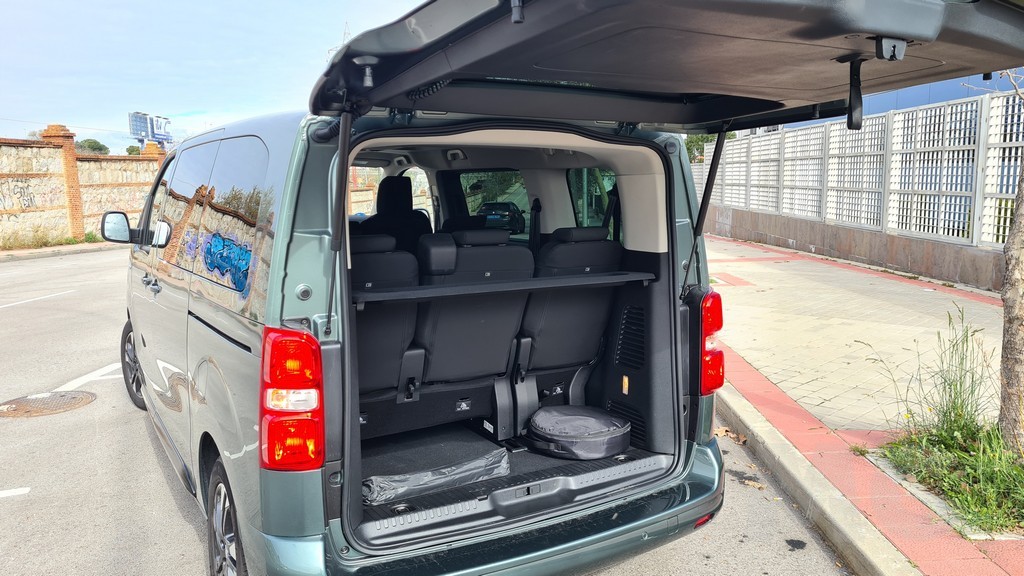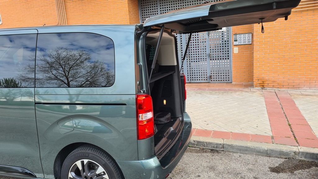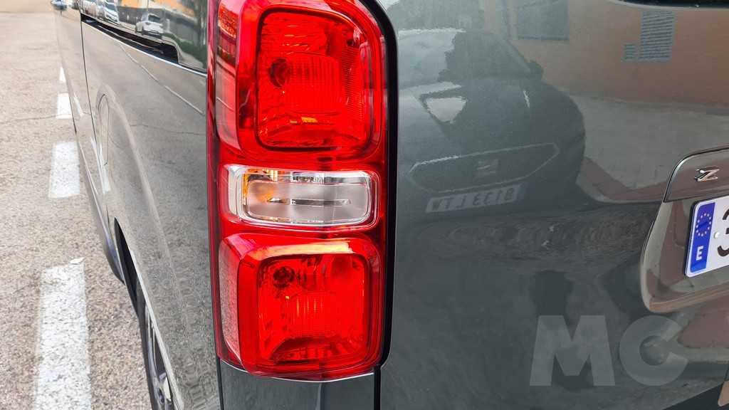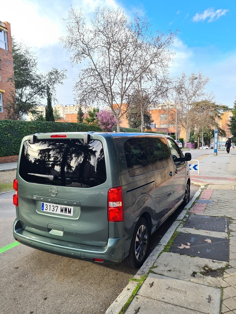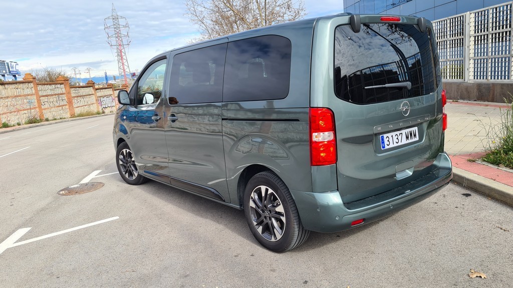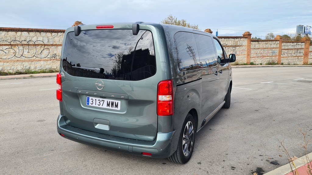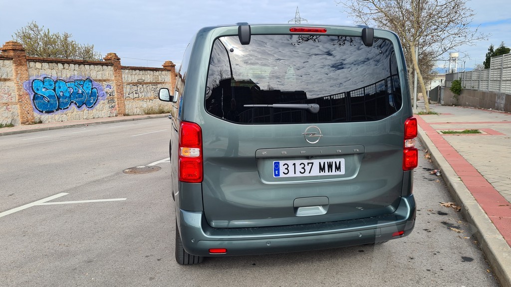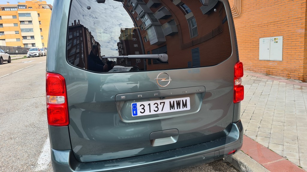 La zaga del Zafira-e sigue la misma filosofía de pragmatismo. Está dominada por un portón trasero de proporciones gigantescas, diseñado para facilitar al máximo las operaciones de carga y descarga. Un detalle de gran inteligencia práctica, heredado de sus hermanos de grupo, es la luneta trasera practicable. Esta permite acceder al contenido del maletero sin necesidad de abrir el enorme portón, una solución muy útil en aparcamientos estrechos o cuando solo se necesita depositar un objeto pequeño. Los enormes grupos ópticos dispuestos verticalmente también siguen la estética de los vehículos comerciales con la practicidad de aumentar la visibilidad con las luces de marcha atrás y advertir al resto del tráfico de que se trata de un vehículo de cierto tamaño.