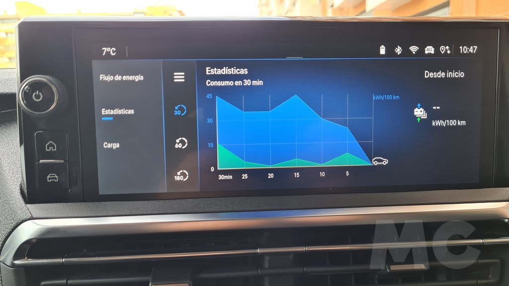 La gestión de la energía se realiza a través de tres modos de conducción: Eco, Normal y Potencia. El modo Eco limita la potencia y optimiza el funcionamiento del climatizador para maximizar la autonomía. El modo Normal ofrece un equilibrio entre rendimiento y eficiencia, mientras que el modo Power libera toda la potencia del motor para obtener la máxima aceleración. Adicionalmente, el sistema de frenada regenerativa cuenta con dos niveles. El modo estándar ofrece una retención suave, similar a la de un motor de combustión. Al activar el modo «B» (Brake) en el selector del cambio, la regeneración se intensifica notablemente, lo que permite decelerar el vehículo de forma considerable al levantar el pie del acelerador y recuperar más energía, aunque no llega a ofrecer una conducción de «pedal único» (one-pedal driving) como otros eléctricos del mercado. La elección de la batería de 75 kWh se revela como fundamental, ya que el consumo real del vehículo es elevado, situándose a menudo entre los 25 y 30 kWh/100 km en condiciones reales.