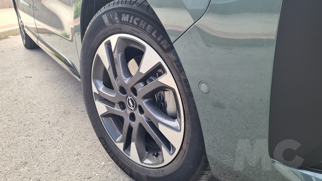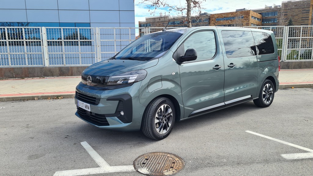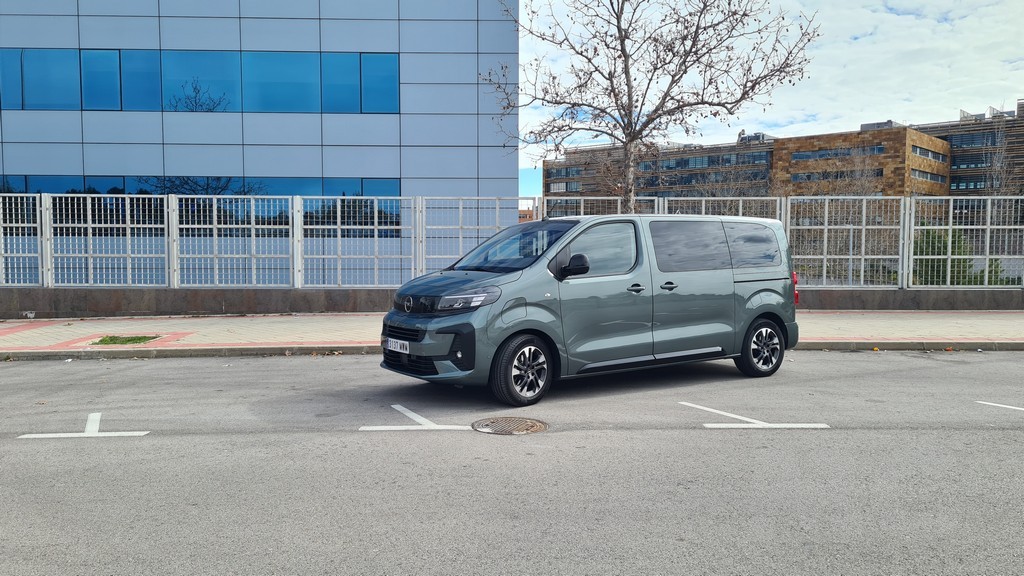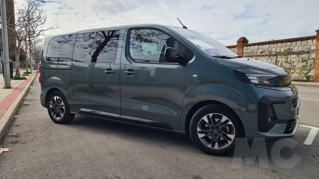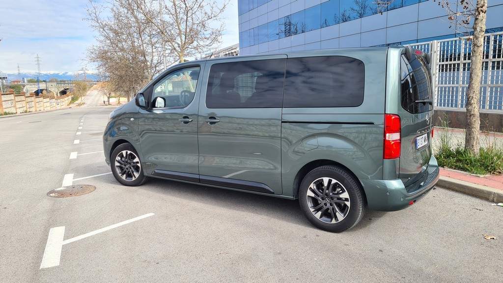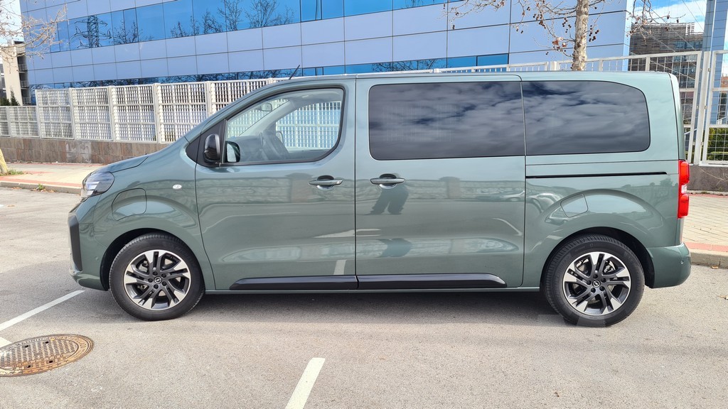 Ya tuvimos la ocasión de probar el Zafira de la anterior generación, pero se han actualizado diversos detalles. Al observar su perfil, la herencia del modelo comercial Vivaro es innegable. La silueta es inevitablemente regular, con líneas rectas y superficies planas diseñadas para optimizar el volumen interior. Está disponible en dos longitudes de carrocería, permitiendo adaptarse a distintas necesidades de espacio. Las grandes puertas correderas laterales, que pueden ser eléctricas en los acabados superiores, garantizan un acceso cómodo y amplio a las plazas traseras. La comparación de tamaño con su antecesor es reveladora del cambio de concepto. La versión L del Zafira-e mide 5.305 mm de largo, 1.920 mm de ancho y 1.890 mm de alto, mientras que el Zafira Tourer de 2017 se conformaba con 4.666 mm de largo, 1.928 mm de ancho y 1.660 mm de alto. Esta generación es pues más de 60 cm más largo y casi 30 cm más alto, una diferencia abismal que evidencia el paso de un monovolumen a un vehículo derivado de comercial. Las llantas de cinco radios son un toque de diseño algo más sofisticado y elegante que contrastan con la estética cuadriculada del perfil del coche.