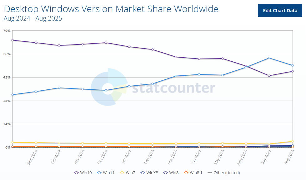 Pero al menos el paso del tiempo y el miedo a quedarse en una versión sin soporte técnico había logrado que Windows 11 subiera en cuota. Hasta ahora. Windows 11 perdió cuota en agosto, algo que no sucedía desde hacía un año. Y no poco, ya que StatCounter indica que bajó más de cuatro puntos porcentuales hasta el 49,02%. Por su parte, Windows 10 ganó casi tres puntos hasta el 45,65%, una cuota que indica que a poco más de un mes de su final del ciclo de vida hay decenas y decenas de millones de computadoras con esta versión.