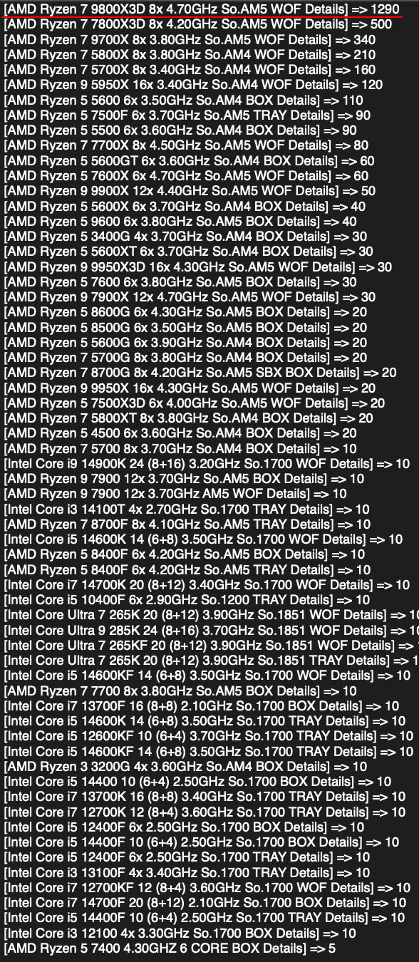 Para poner este dato en contexto, el segundo procesador más vendido durante dicho periodo fue el Ryzen 7 7800X3D, y este registró 500 unidades vendidas. En tercera posición está el Ryzen 7 9700X con 340 unidades vendidas, y en cuarta y quinta posición tenemos a los Ryzen 7 5800X y Ryzen 7 5700X con 210 y 160 unidades vendidas.