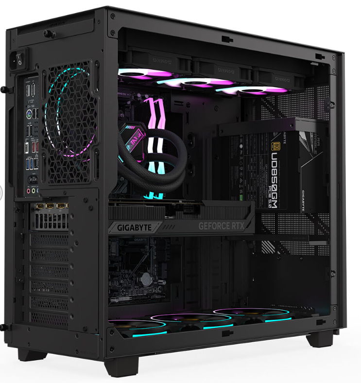 Los ventiladores (cuatro preinstalados) trabajan en conjunto con un sistema de refrigeración líquida de 360 mm y el mismo chasis persigue elevar el flujo de aire para garantizar un rendimiento estable incluso con cargas de trabajo pesadas. La prioridad es mantener a raya las temperaturas y para ello incluye un área de entrada de malla del 80% y ventilaciones laterales adicionales que a la vez mejoran el brillo de la iluminación ARGB.
