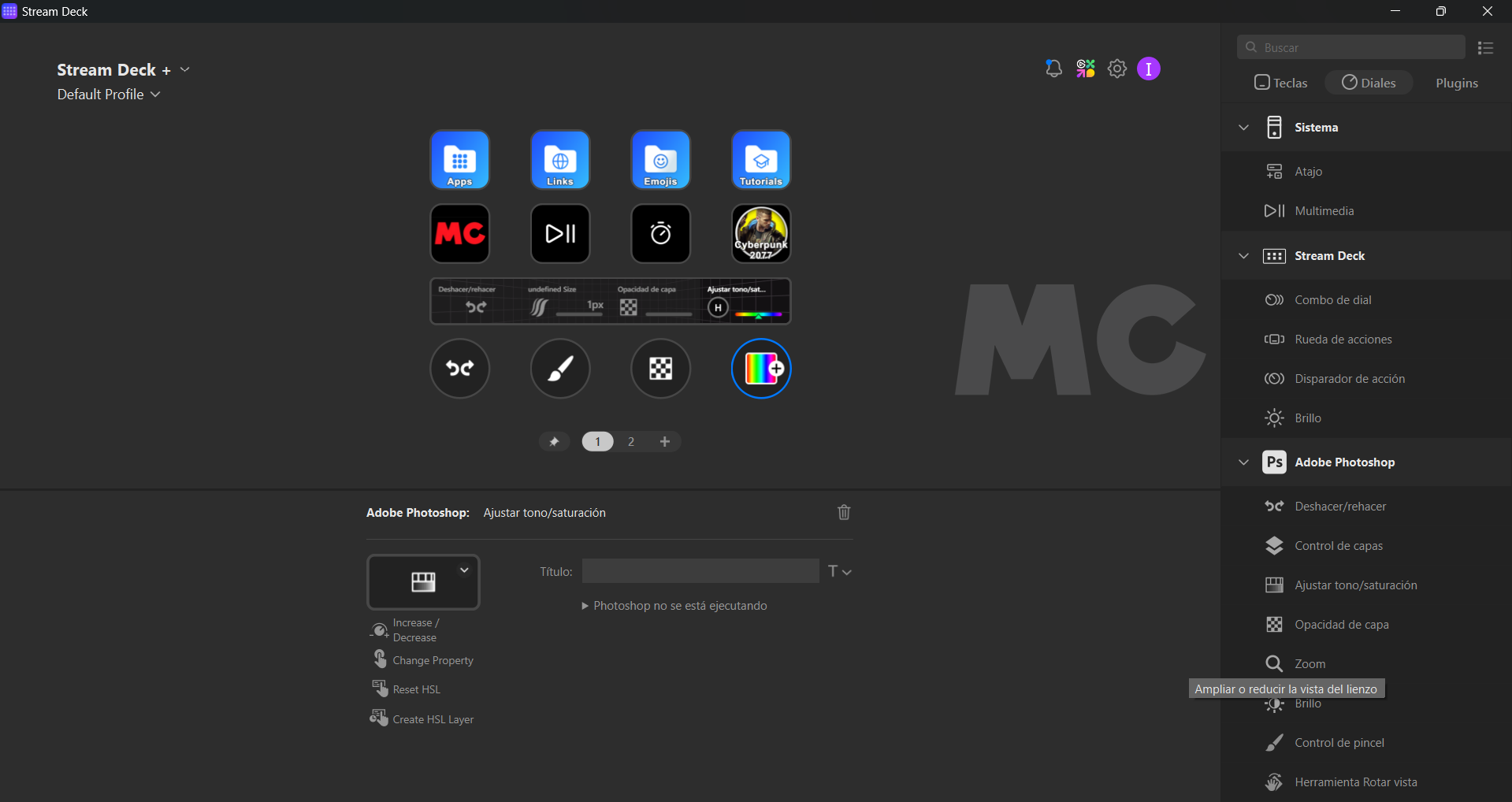 En los diales contaba con funciones muy útiles, como «deshacer y rehacer» en el primer dial girando a izquierda o a derecha, bajar o subir el volumen también girando a izquierda o a derecha, bajar y subir el brillo de Elgato Stream Deck +.
