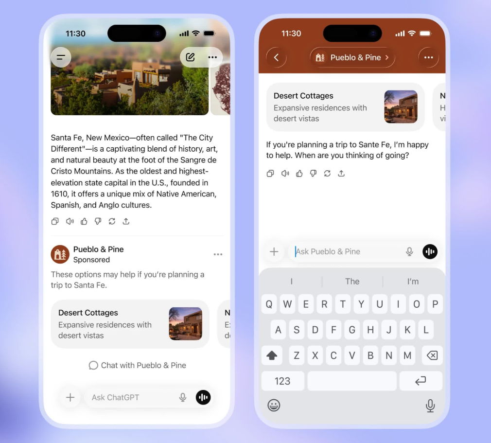 La compañía también ofrecerá una opción para desactivar la personalización de anuncios y los incluirá inicialmente en dos formatos. Primero, se mostrarán anuncios al final de las respuestas en ChatGPT cuando haya un producto o servicio patrocinado relevante según la conversación actual. Por ejemplo, si buscas lugares para visitar en una ciudad, podrías ver anuncios de hoteles en esa ciudad.