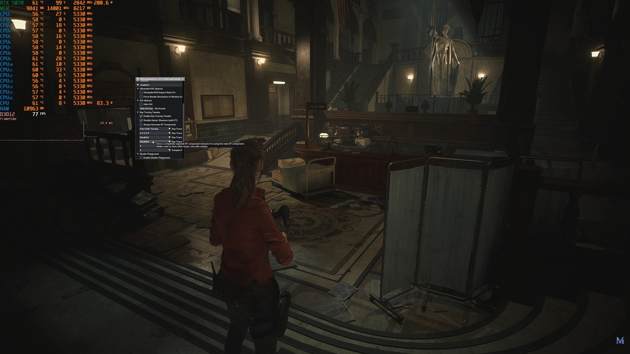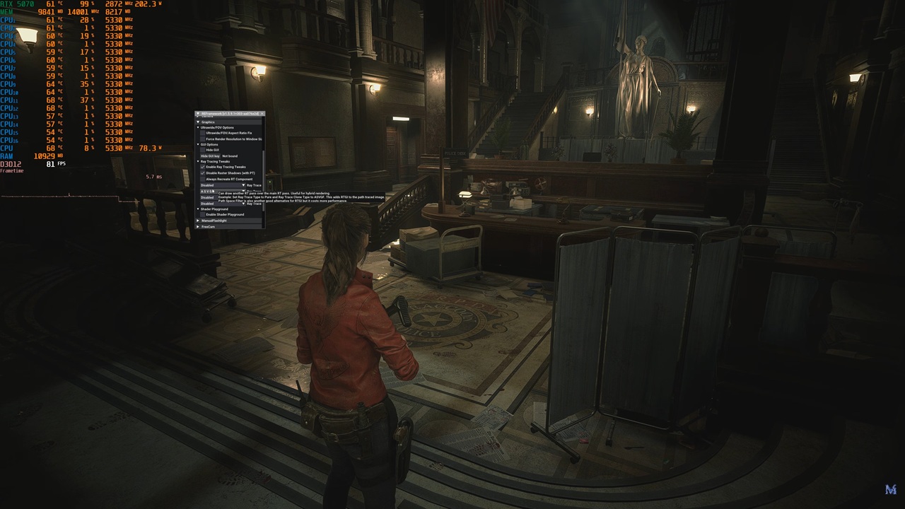 Por ejemplo, en Resident Evil 2 Remake podemos ver que con el mod activado, en la escena de la comisaría de policía, tenemos unas sombras más realistas y ciertos objetos que no generaban sombras pasan a mostrarlas. La intensidad de la iluminación también es más realista y acorde a las fuentes de luz presentes en general.