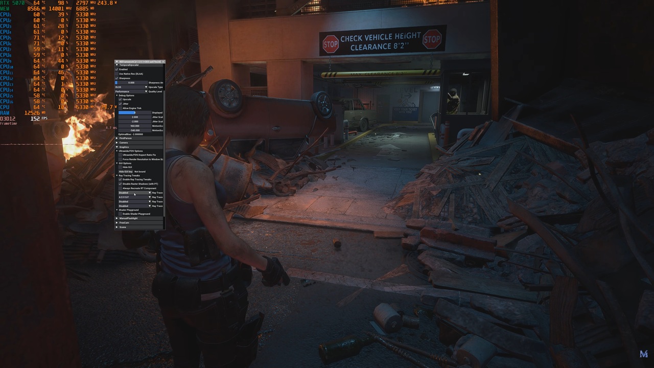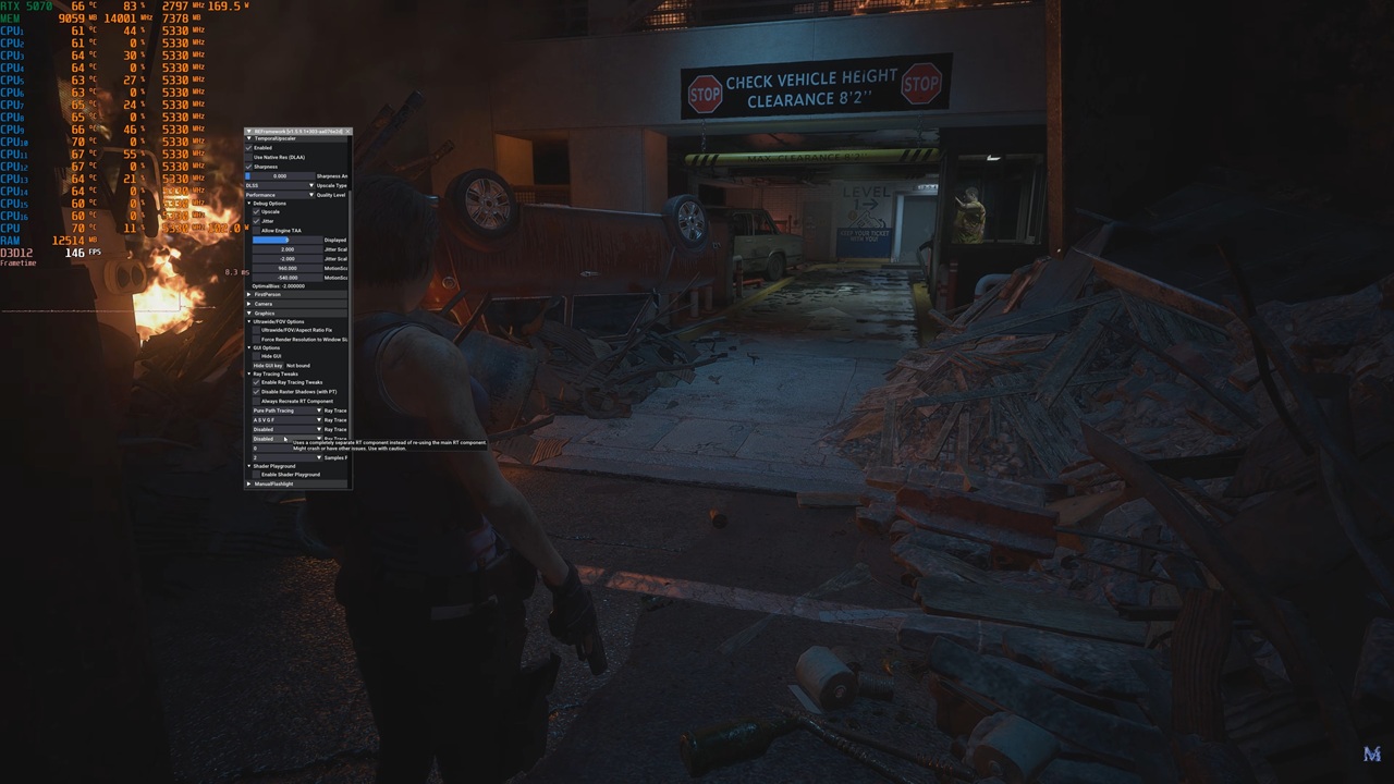 Sin embargo, en Resident Evil 3 Remake tenemos una zona central demasiado oscura a pesar de que a la izquierda hay un fuego considerable que debería iluminar mejor de forma indirecta el centro, al personaje y los escombros. No obstante, en la zona más alejada, dentro del parking, el mod que añade trazado de trayectorias hace un trabajo bastante mejor.