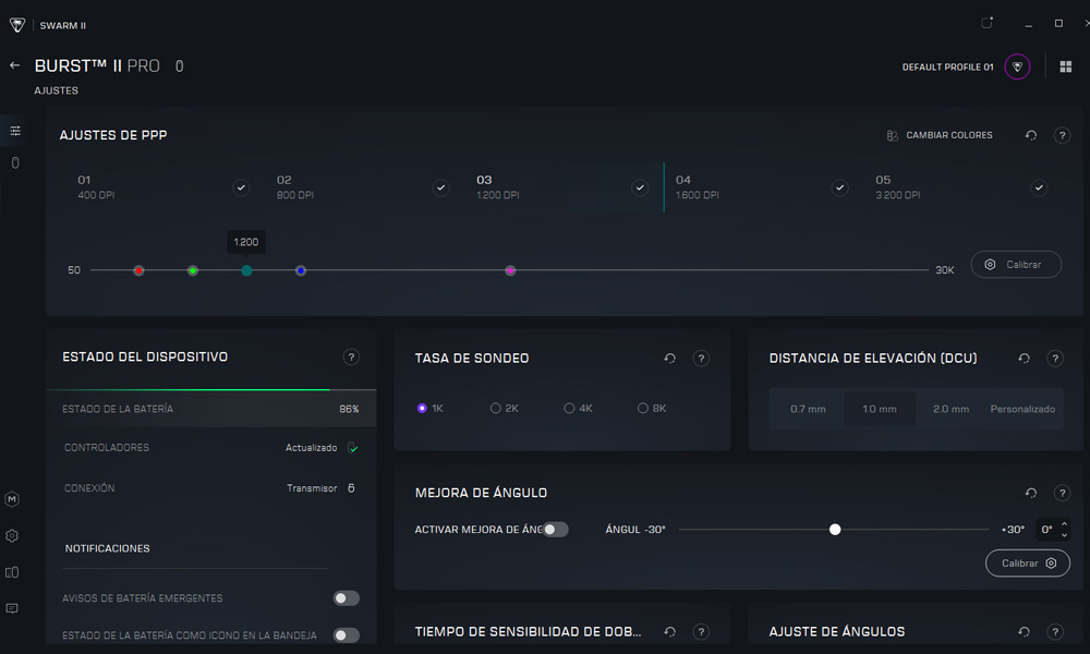 Desde el panel del Burst II Pro podemos ajustar la tasa de sondeo hasta los 8K —eligiendo entre máxima fluidez para competitivo o ahorro de batería para ofimática— y configurar de forma detallada los niveles de DPI y la distancia de levantamiento (lift-off distance), algo especialmente útil para los que trabajan en diseño y necesitan que el cursor no salte al reposicionar el ratón.