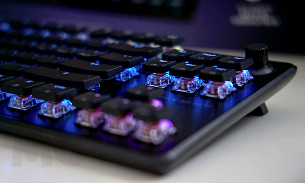 El Vulcan II TKL mantiene esa estética industrial tan reconocible de la marca. La placa superior de aluminio cepillado no es solo decoración: aporta una rigidez estructural que se percibe desde que lo sacas de la caja. El formato Tenkeyless es una bendición para quienes necesitan espacio para mover el ratón, aunque los que trabajan mucho con hojas de cálculo van a echar en falta el bloque numérico. Un detalle que se agradece mucho en el día a día es la rueda de volumen dedicada con función de clic para silenciar: parece menor, pero acaba siendo de esas cosas que usas constantemente.