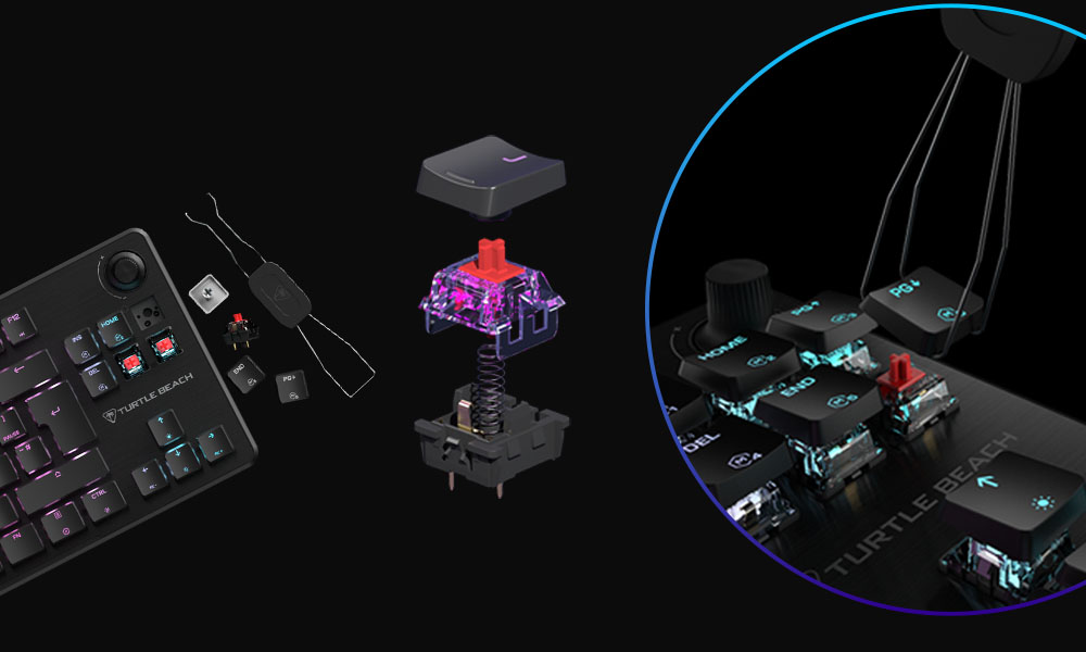 El teclado, por su parte, brilla gracias a los interruptores TITAN HS y su rápida respuesta. Pero más allá del rendimiento inmediato, hay un aspecto que merece atención: la capacidad hot-swap. Poder cambiar los switches sin soldar garantiza que el teclado pueda durar años, ya sea porque quieras personalizar la sensación de cada tecla o simplemente sustituir alguna que falle con el tiempo. Turtle Beach incluye en la caja un extractor de teclas y switches junto con tres interruptores de repuesto, un detalle que se agradece.