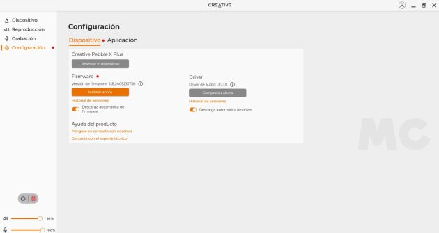 Si conectamos los Creative Pebble X Plus mediante cable USB Type-C, o a través de Bluetooth, podremos vincularlos a la aplicación dedicada de Creative, que es totalmente gratuita e incluye funciones avanzadas de gran valor, como podemos ver en la galería adjunta.