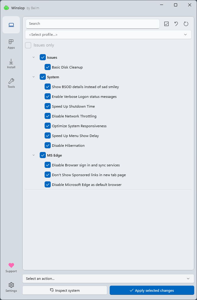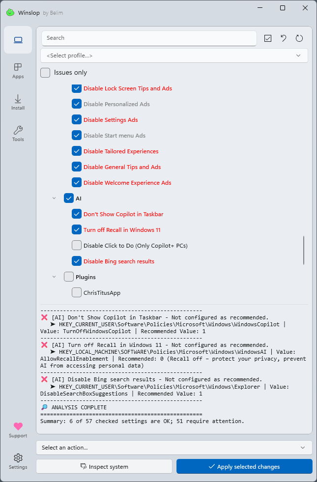 Las nuevas versiones de Winslop no son solo apariencia y mantienen su enorme potencia para eliminar las funciones de inteligencia artificial y otras muchas aplicaciones añadidas forzadamente como Bloatware. También añade herramientas de optimización de sistema, contra la telemetría para mejorar la privacidad del sistema o contra los anuncios en Windows.