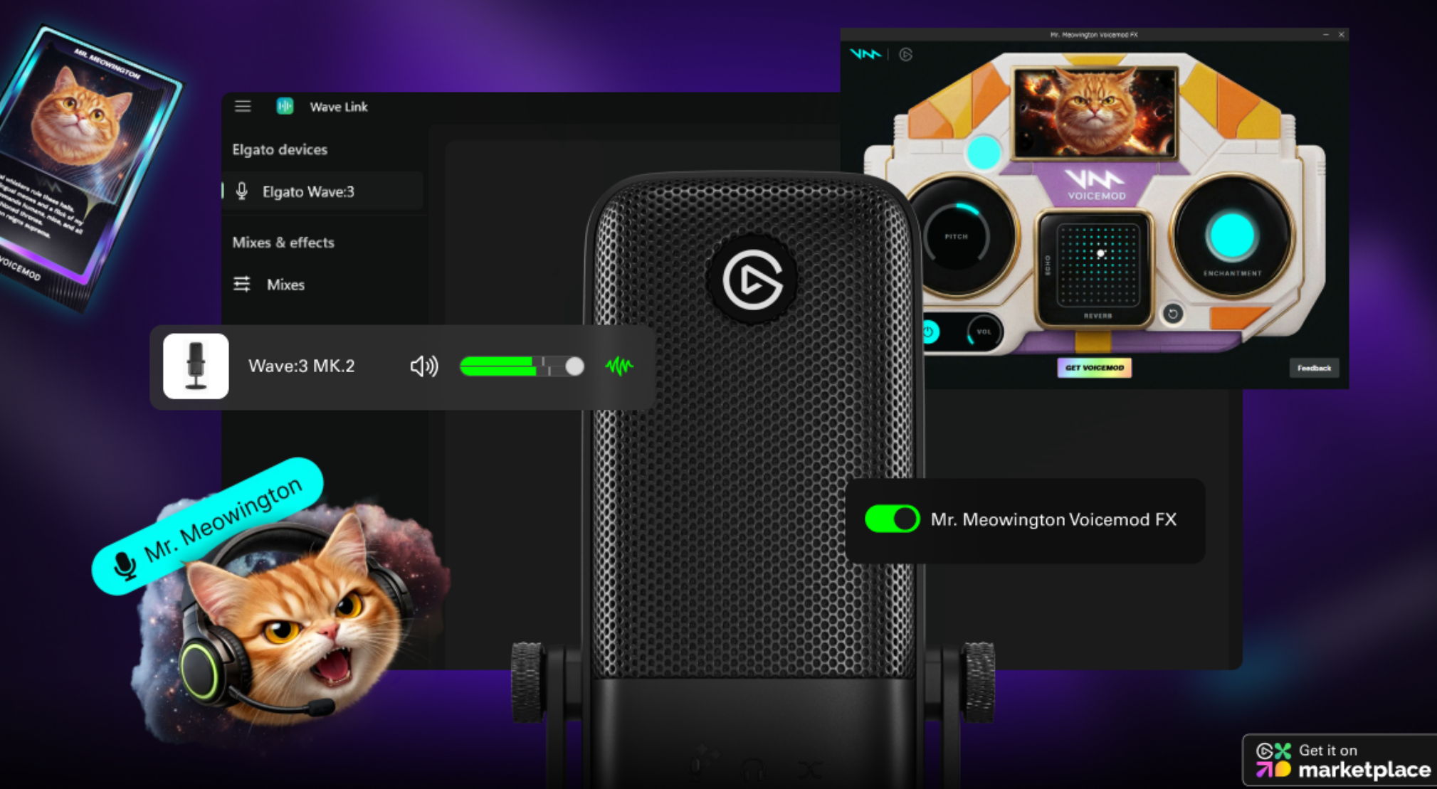 Los jugadores ya pueden explorar cambiadores de voz Voicemod gratuitos y premium directamente en el Marketplace. Las voces abarcan desde comunicaciones militares hasta personajes de anime y dragones que escupen fuego, y se añadirán más con el tiempo. Se instalan directamente en Wave Link con solo unos pocos clics y se pueden aplicar a cualquier micrófono para usar en juegos o chat de voz. Cada uno cuenta con una interfaz personalizada, lo que hace que los ajustes sean inmersivos e intuitivos.