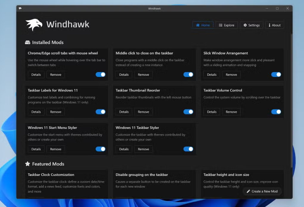 Incluye mods propios, pero también invita a terceros desarrolladores a incluir los suyos para que estén disponibles desde el cliente general, que funciona como plataforma ligera donde puedes seleccionar los modos individuales que se ajusten exactamente a tus necesidades. Cada mod es un pequeño fragmento de código C++ que Windhawk inyecta en los procesos de Windows. Destacar, además, que el desarrollador incluye el código fuente de todos ellos en un ejercicio de transparencia.