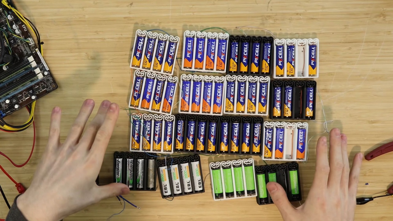 En total se utilizaron 64 pilas AAA de 1,5 voltios. Para conectar esas pilas al PC se interconectaron todas las pilas para crear un bloque capaz alcanzar los 25 voltios. De esa manera fue posible reducir la intensidad de la corriente que tiene que pasar por el cableado. Dicho cableado está conectado con tres reguladores de voltaje trabajando en paralelo, que realizan una conversión final a 12 voltios, que es lo que acaba llegando al PC.