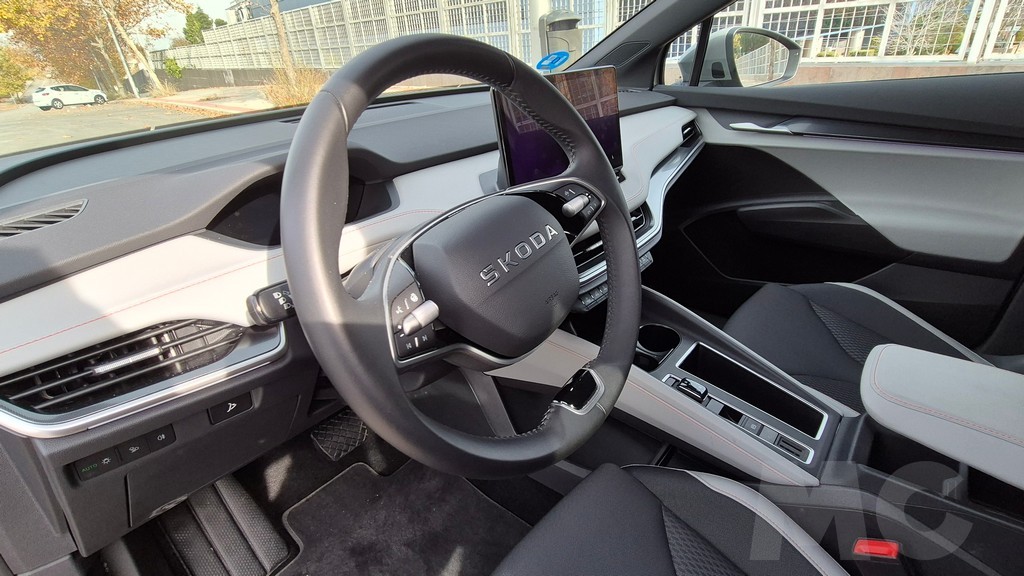 En cuanto a los materiales con vocación sostenible, Skoda ha apostado decididamente por las fibras recicladas. La Design Selection Lodge usa TechnoFil fabricado con fibras de nailon recuperadas, mientras que la Design Selection Loft incorpora RecyTitan, un material compuesto por un 78% de PET reciclado. No son meros gestos de imagen: la textura y el tacto de estos tejidos resultan genuinamente agradables y aportan un carácter diferencial que el Volkswagen ID.4 o el Ford Explorer eléctrico no tienen en sus versiones de acceso. El volante de dos radios, con el nombre Skoda en letras, tiene un diámetro y un agarre muy bien calibrados.