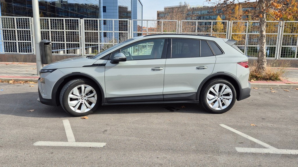 Visto de lado, el Elroq transmite la misma solidez y aplomo que caracteriza a la filosofía Modern Solid, aunque las reminiscencias con el Enyaq son inevitables. Las líneas son limpias y sin adornos, con una superficie de chapa extensa que da sensación de robustez. Los pasos de rueda están levemente marcados, sugiriendo músculo sin caer en el exceso. El punto de carga se sitúa en el lateral derecho, una ubicación práctica en parkings pero que algunos usuarios pueden encontrar incómoda en gasolineras o cargadores de acceso por la izquierda.