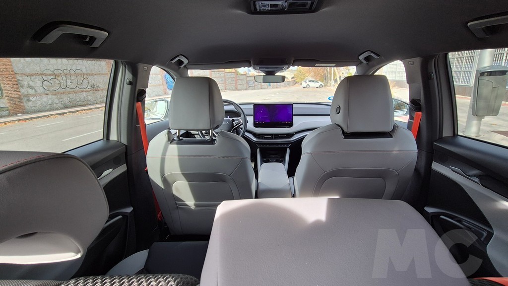 La arquitectura MEB permite que el Elroq ofrezca una habitabilidad trasera que sorprende por generosa para sus dimensiones exteriores. La altura del asiento al techo en las plazas traseras alcanza los 990 mm, suficiente para que un adulto de estatura media viaje sin rozar el techo. El espacio para los hombros en la fila trasera es de 1.488 mm, apenas 18 mm menos que en los asientos delanteros, lo que convierte la segunda fila en un espacio genuinamente cómodo para tres adultos en trayectos cortos, aunque para viajes largos la anchura aconseja dos ocupantes traseros para mayor comodidad.