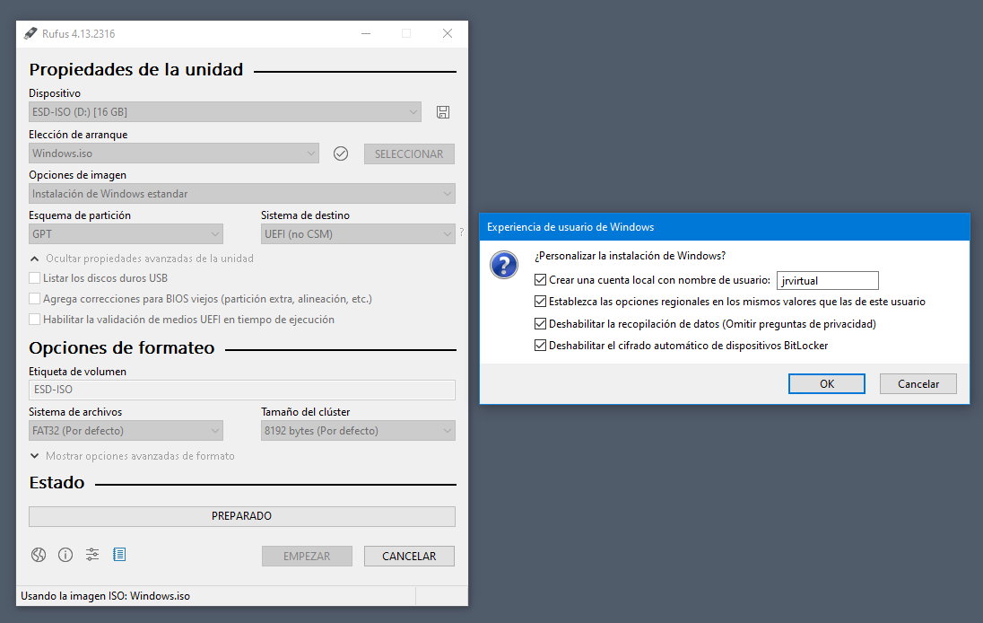 Una vez que Microsoft eliminó el uso de sencillos scripts que durante la instalación permitían el desbloqueo, una opción efectiva sigue siendo Rufus. El popular ‘quemador’ de imágenes de Windows permite configurar el medio de instalación para el uso de cuentas locales. Para ello, descarga la imagen de Windows; ejecuta Rufus y en las opciones de creación de imágenes selecciona la cuenta local. Sirve de la misma manera para Windows 11 o si eres de los que has mantenido Windows 1o con el programa ESU.