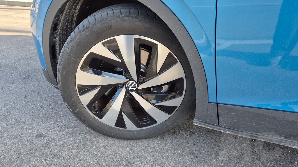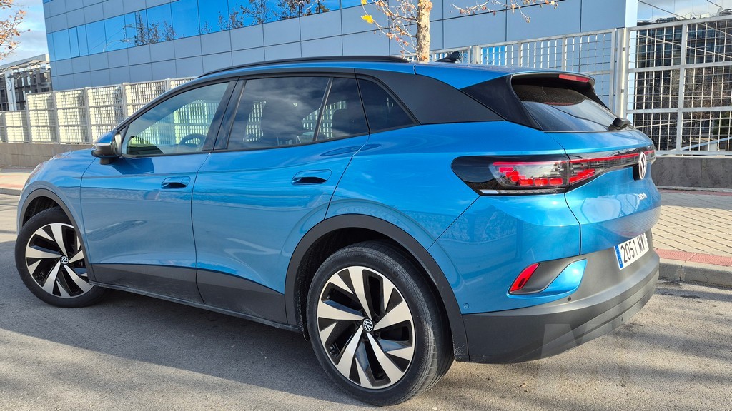 Visto de costado, el ID.4 muestra las proporciones propias de un SUV de segmento C con líneas muy fluidas. La altura de conducción es generosa pero no exagerada, y la línea de cintura elevada junto a las ventanillas de tamaño moderado dan al coche un aspecto sólido y musculoso. Una línea de carácter arranca desde el arco del paso de rueda delantero y recorre el lateral hasta fundirse con los pilotos traseros, añadiendo dinamismo a un perfil que podría resultar demasiado ordenado sin ese recurso estilístico. Los pasos de rueda tienen un tratamiento plástico pronunciado que subraya la anchura del coche y le aporta un carácter todocamino discreto. La longitud total de 4.584 mm y la batalla de 2.771 mm son datos que posicionan al ID.4 en la parte alta del segmento C, casi rozando el D, lo que se traduce en una silueta de proporciones muy equilibradas. Las llantas de aleación de 19 pulgadas de serie en la versión Pro, con la opción de pasar a las de 20 o 21 pulgadas, completan un lateral que no dejará a nadie indiferente aunque tampoco generará adhesiones incondicionales.