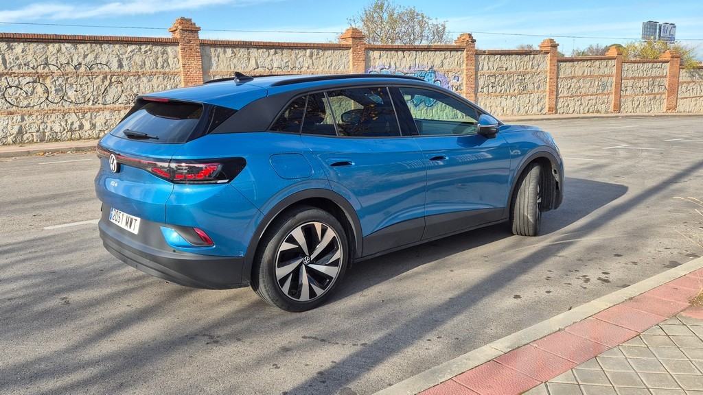La zaga del ID.4 es uno de sus elementos más reconocibles. Una tira de LED conecta ambos grupos ópticos de extremo a extremo, generando una firma luminosa horizontal que en la oscuridad hace el coche visualmente más ancho de lo que ya es. Los pilotos tienen una forma alargada y angular que contrastan ligeramente con la suavidad del resto de las líneas del coche, aportando un toque de carácter. El portón trasero tiene un diseño limpio con el logotipo de Volkswagen en el centro y el nombre del modelo en letras independientes a la derecha. El paragolpes trasero es voluminoso y protector, con los sensores de aparcamiento integrados de forma discreta. La ausencia de cualquier elemento deportivo añadido, como difusores o spoilers, refuerza la imagen de un coche diseñado para la practicidad y el confort antes que para la emoción visual, algo que algunos usuarios agradecerán y otros lamentarán. La apertura del maletero es eléctrica en las versiones bien equipadas y el ángulo de apertura del portón es generoso, facilitando la carga de objetos voluminosos.