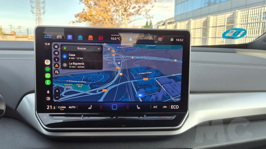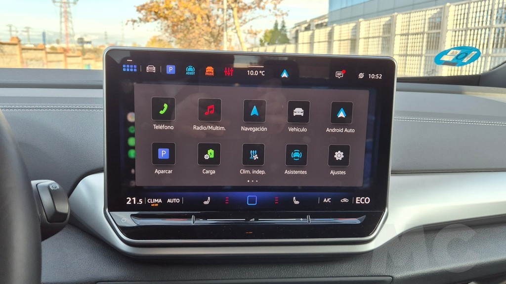 El sistema de infoentretenimiento del ID.4 actualizado incorpora una pantalla táctil central de 12,9 pulgadas que en la versión Pro sustituye a la anterior de 12 pulgadas. Es una pantalla de buena resolución y con una respuesta táctil notablemente mejorada respecto a las versiones anteriores del modelo, que fueron ampliamente criticadas por su lentitud y sus fallos de software. La actualización de software a la versión 4.0 que acompaña al rediseño de 2024 introduce un menú reorganizado más accesible, con una barra superior permanente que da acceso directo a las principales aplicaciones y un Car Control Centre visible en todo momento para las funciones más utilizadas del vehículo. La compatibilidad con Apple CarPlay y Android Auto de forma inalámbrica es uno de los añadidos más valorados, ya que el mapa de Google y la reproducción musical de Spotify o similares resultan más intuitivos para la mayoría de los conductores que la navegación propia del coche. También se incluye una zona de carga inalámbrica para el móvil bajo la pantalla, junto a dos puertos USB-C delanteros.