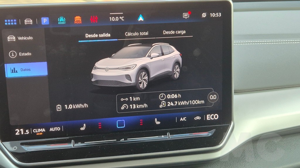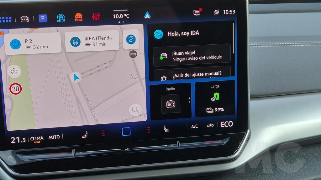 En el uso de viaje, la planificación de paradas de carga se convierte en parte de la experiencia. El navegador integrado, o mejor aún Apple CarPlay o Android Auto con ABRP (A Better Route Planner), calcula las paradas óptimas en función de la carga actual y el consumo esperado. La capacidad de hasta 175 kW en carga rápida supone una ventaja real respecto a rivales que siguen limitados a 100-120 kW. A 150 kW reales, una parada de veinte minutos puede añadir más de 200 km de autonomía, suficiente para completar etapas largas con una única parada en rutas peninsulares. Volkswagen incluye en España acceso a la red Ionity con condiciones ventajosas para propietarios de ID, lo que facilita las recargas en autopista con la máxima potencia disponible. El consumo en autopista a velocidad constante de 120 km/h se sitúa entre 18 y 21 kWh/100 km según las condiciones meteorológicas, temperatura y ocupación del vehículo.