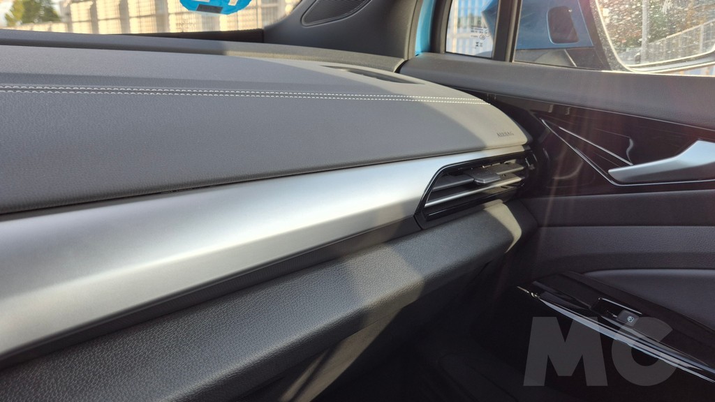 Al entrar en el habitáculo del ID.4 la primera impresión es de amplitud. El salpicadero sigue el concepto One Space de Volkswagen para sus eléctricos, con una disposición limpia y horizontal en la que la pantalla central domina el conjunto. Los materiales generan una percepción ambivalente. Por un lado, las superficies que el conductor y el acompañante tocan con más frecuencia, como el volante forrado en cuero, los mandos de las puertas y los apoyabrazos, tienen una calidad táctil satisfactoria. Por otro, las zonas inferiores del salpicadero y algunos paneles laterales recurren a plásticos duros que resultan incongruentes con el precio del coche.