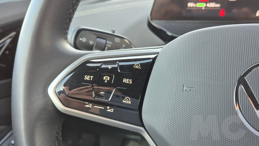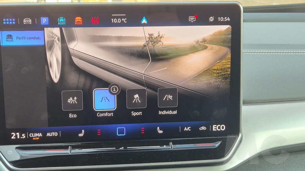 El ID.4 ofrece tres modos de conducción seleccionables desde la pantalla central: Eco, Comfort y Sport. El modo Eco reduce la potencia máxima disponible, ajusta la climatización para consumir menos energía y suaviza la respuesta del acelerador, maximizando la autonomía a costa de cierta vivacidad. El modo Comfort es el equilibrio natural del coche, con una respuesta del acelerador progresiva y agradable que resulta la mejor opción para el uso cotidiano. El modo Sport libera la potencia máxima del motor, endurece la dirección y agudiza la respuesta al acelerador, transformando la experiencia de conducción de forma notable. Independientemente del modo seleccionado, el conductor puede ajustar el nivel de frenada regenerativa mediante dos paletas tras el volante o mediante el selector de cambio, que en posición B activa la máxima recuperación de energía y permite una conducción de un solo pedal en la mayoría de situaciones urbanas.