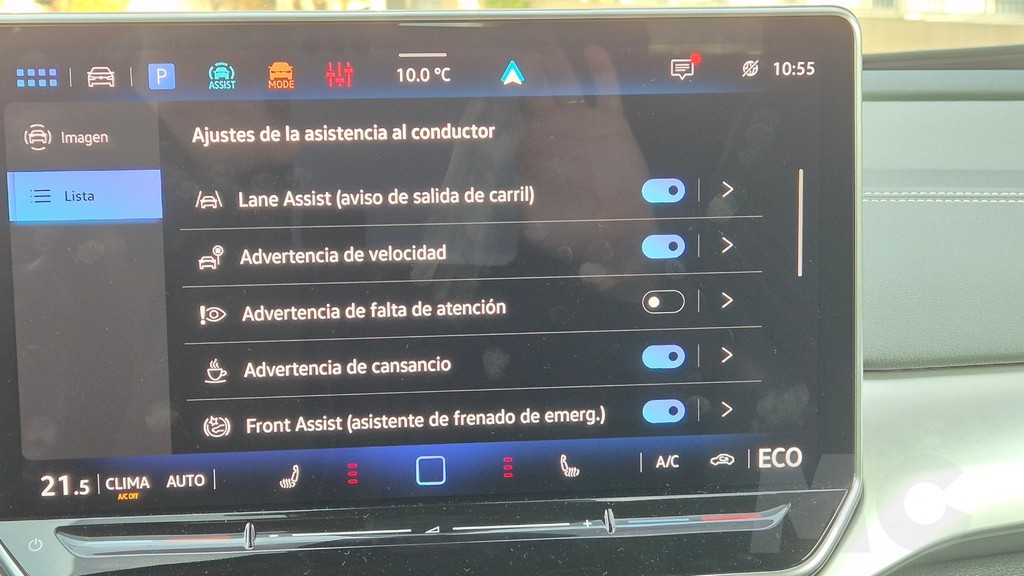 El ID.4 viene equipado de serie en la versión Pro con un conjunto completo de sistemas de asistencia que Volkswagen agrupa bajo la denominación IQ.Drive. El control de crucero adaptativo con función de parada y arranque en atascos funciona de forma fluida y es capaz de mantener la distancia con el vehículo precedente en autopista con una naturalidad que contribuye a reducir la fatiga en trayectos largos. El asistente de mantenimiento de carril actúa sin brusquedades aunque es algo pasivo a la hora de corregir desviaciones. El aviso de punto ciego en los retrovisores resulta muy útil en los cambios de carril en autopistas de varios carriles. Los sensores de aparcamiento delanteros y traseros y la cámara trasera facilitan las maniobras urbanas en un coche de casi 1,85 metros de ancho. El sistema de frenado de emergencia autónomo con detección de peatones y ciclistas funciona con eficacia. El reconocimiento de señales de tráfico con aviso al conductor completa un conjunto que se sitúa a la altura de lo que ofrecen sus principales rivales en el segmento.