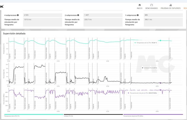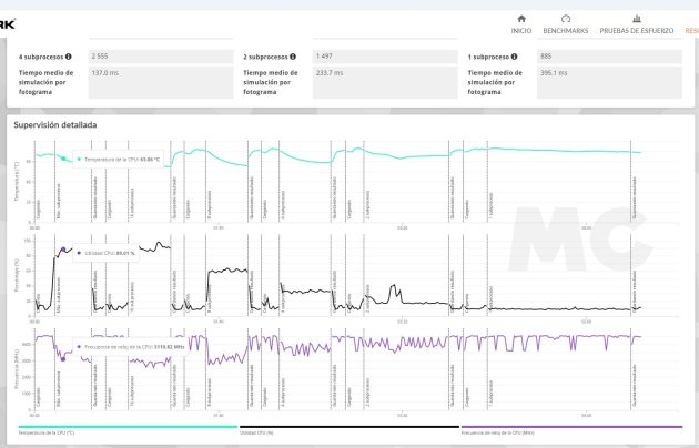 - Con el máximo número de hilos activos se utilizan también 12 hilos, como en el caso anterior, porque es el máximo del procesador. En esta subprueba la velocidad mínima supera los 3,1 GHz y vemos algún pico de casi 4 GHz. La temperatura media ronda los 65 grados C.