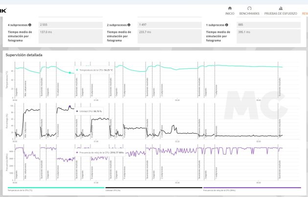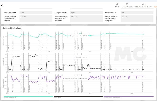 Para confirmar esto, vamos a ver cómo escala en velocidad y temperatura en cada subprueba: