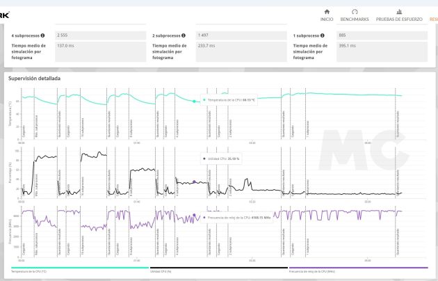 - Con cuatro hilos activos ya tenemos fluctuaciones de frecuencia todavía más marcadas. El pico es de 4,10 GHz, y la temperatura empieza en un pico de más de 70 grados C, pero baja notablemente hasta mantenerse en unos 60,10 grados C.
