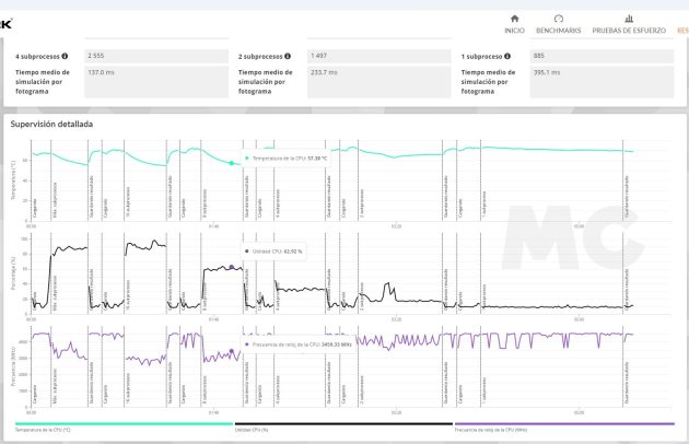 - Con ocho hilos activos el pico de frecuencia es de 3,45 GHz, y la temperatura sigue el mismo patrón que en la anterior subprueba, empieza más alta y se estabiliza por debajo de los 60 grados C.