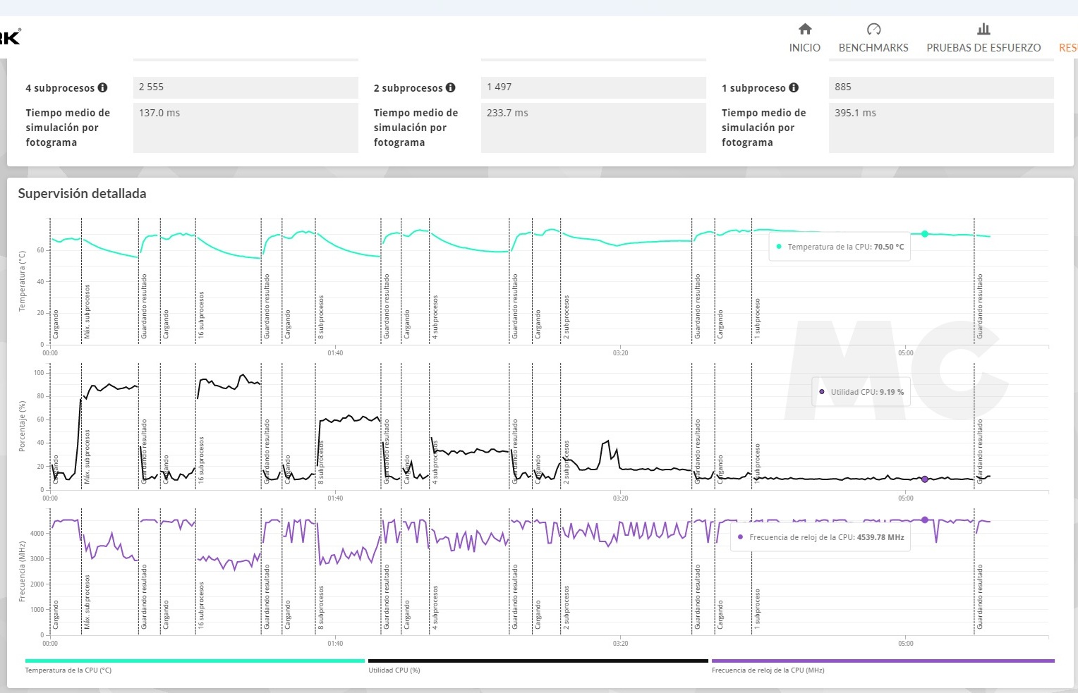 Para confirmar esto, vamos a ver cómo escala en velocidad y temperatura en cada subprueba: