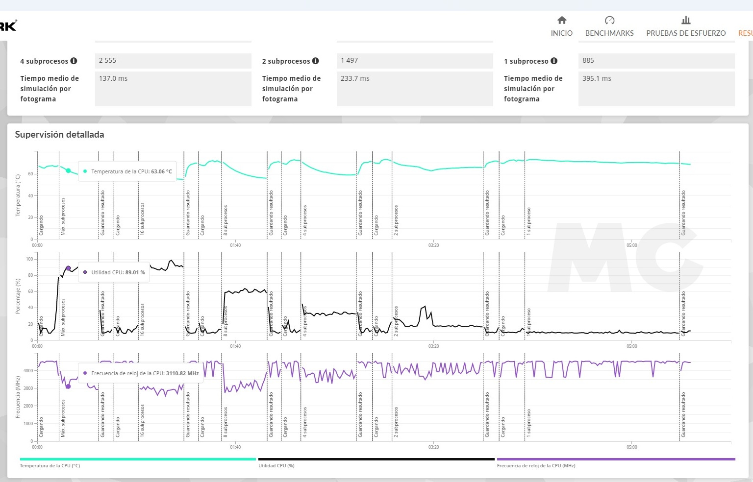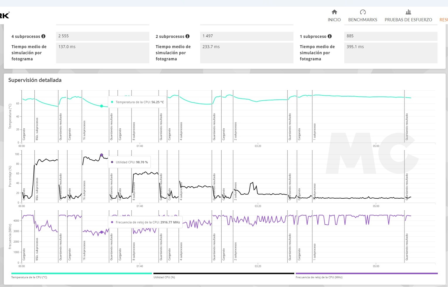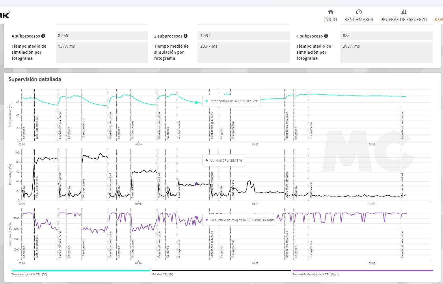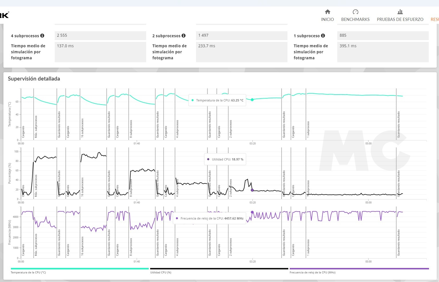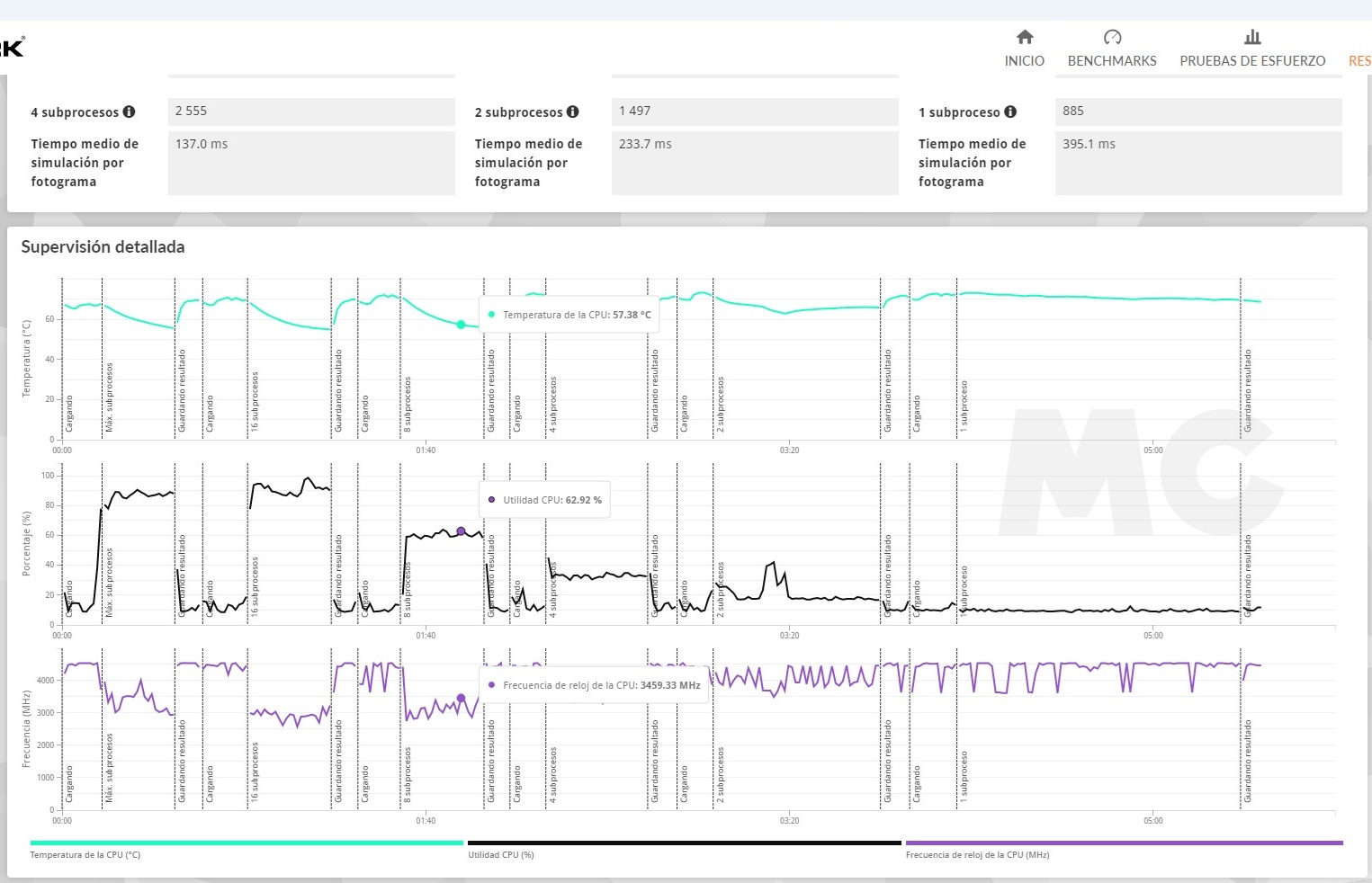 - Con ocho hilos activos el pico de frecuencia es de 3,45 GHz, y la temperatura sigue el mismo patrón que en la anterior subprueba, empieza más alta y se estabiliza por debajo de los 60 grados C.