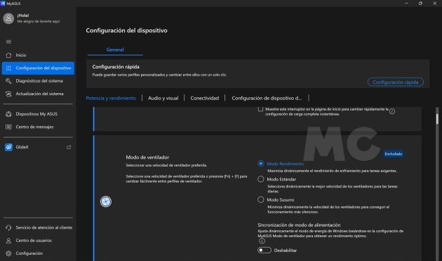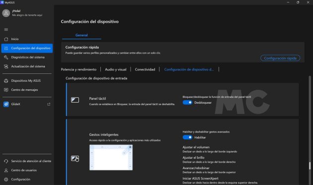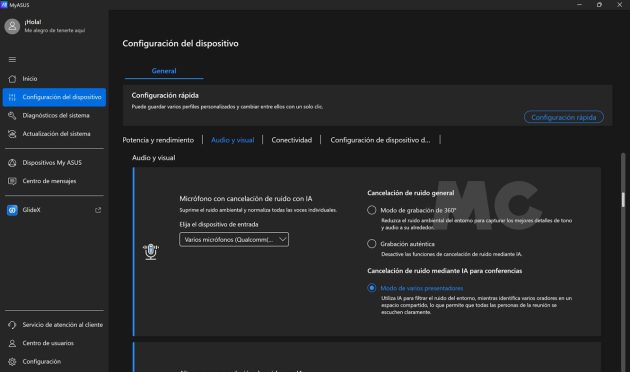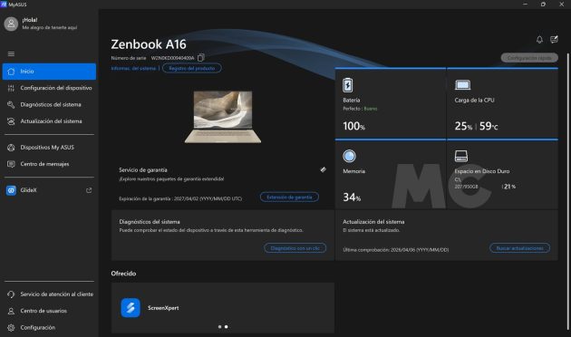 El ASUS Zenbook A16 viene con el software MyASUS preinstalado, todo un clásico que como recordarán nuestros lectores habituales nos permite personalizar y configurar diferentes ajustes del equipo, como por ejemplo cambiar el perfil de rendimiento, activar funciones de IA para mejorar determinados aspectos del portátil, como el sonido, la cámara y los micrófonos, entre otras muchas cosas.