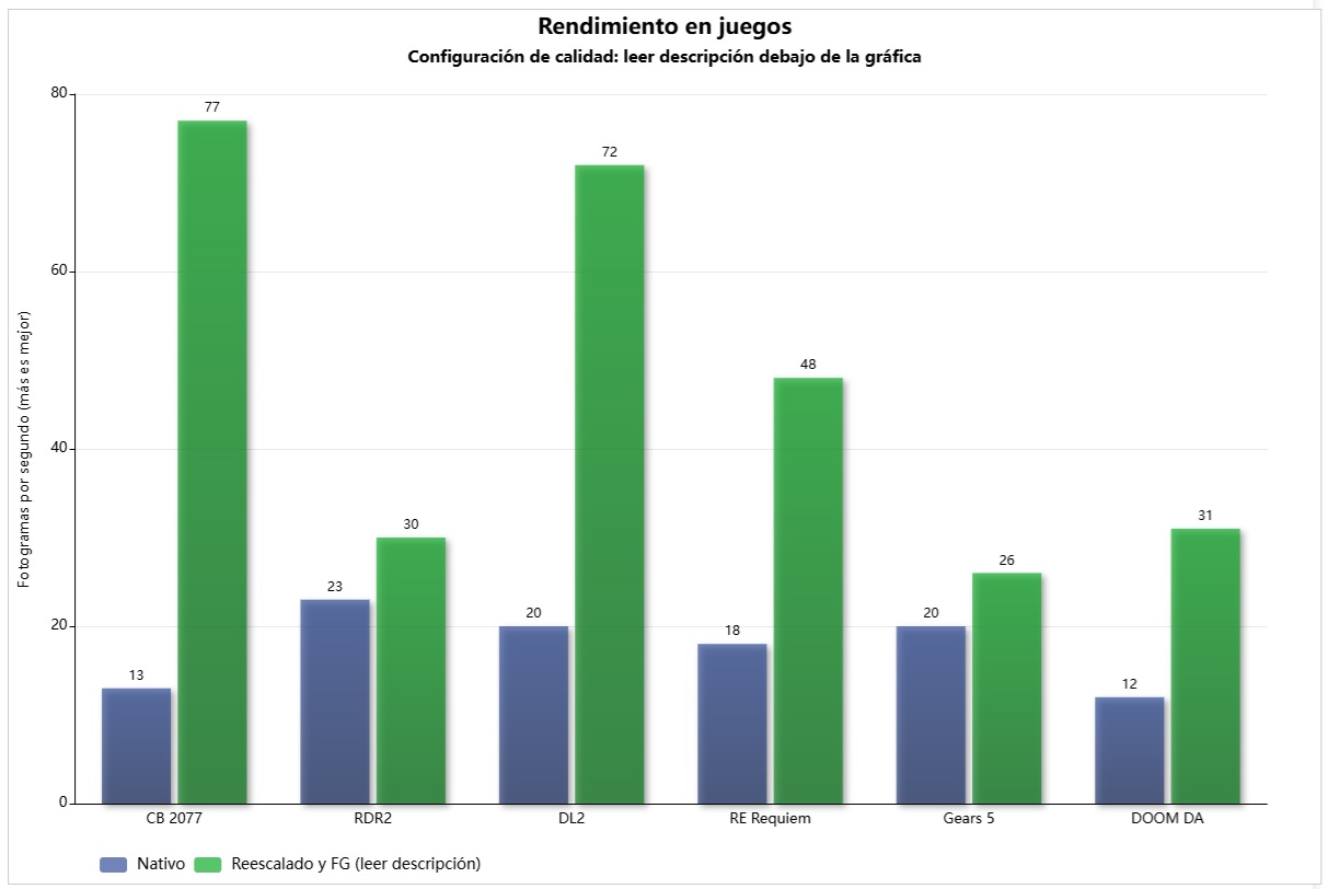 - Resident Evil Requiem: nativo y calidad máxima en barra azul, FSR en modo rendimiento y generación de fotogramas x2 en la barra verde.