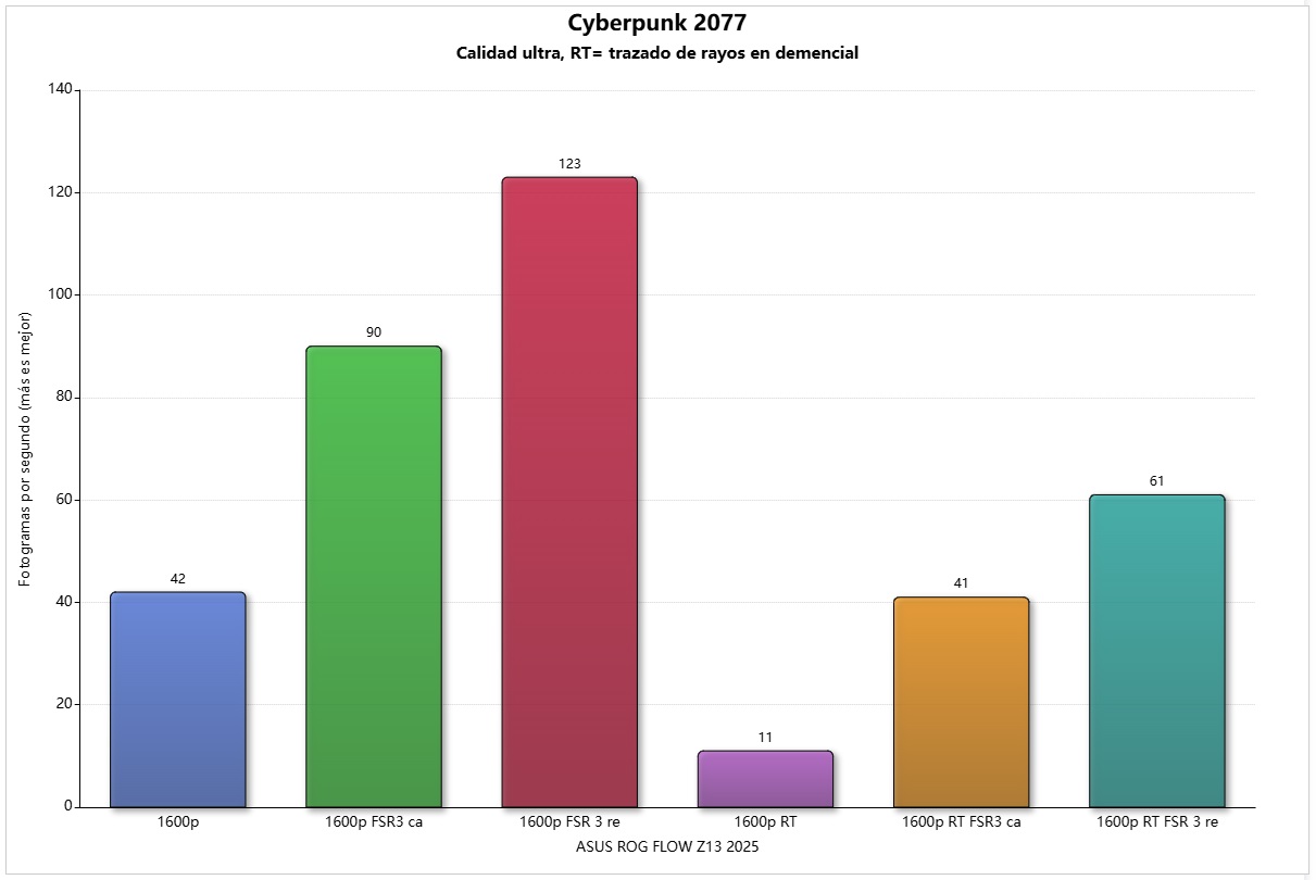 Si comparamos con la Radeon 8060s entendemos al instante por qué es considerada como la gráfica integrada más potente que existe. Es capaz de mover Cyberpunk 2077 en 1600 nativo y con calidad ultra a 42 FPS, lo que significa que incluso a 1800p superaría en más del doble el rendimiento de la Intel Arc B390.