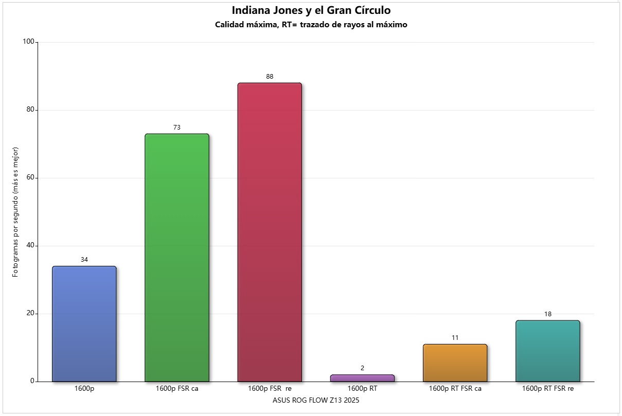 Con Indiana Jones, que utiliza trazado de rayos nativo y es muy exigente. Tenemos una media de 34 FPS en 1600p con calidad máxima sin reescalado. En la gráfica, cuando menciono trazado de rayos al máximo me refiero a que se activó el trazado de rayos completo, también conocido como trazado de trayectorias.