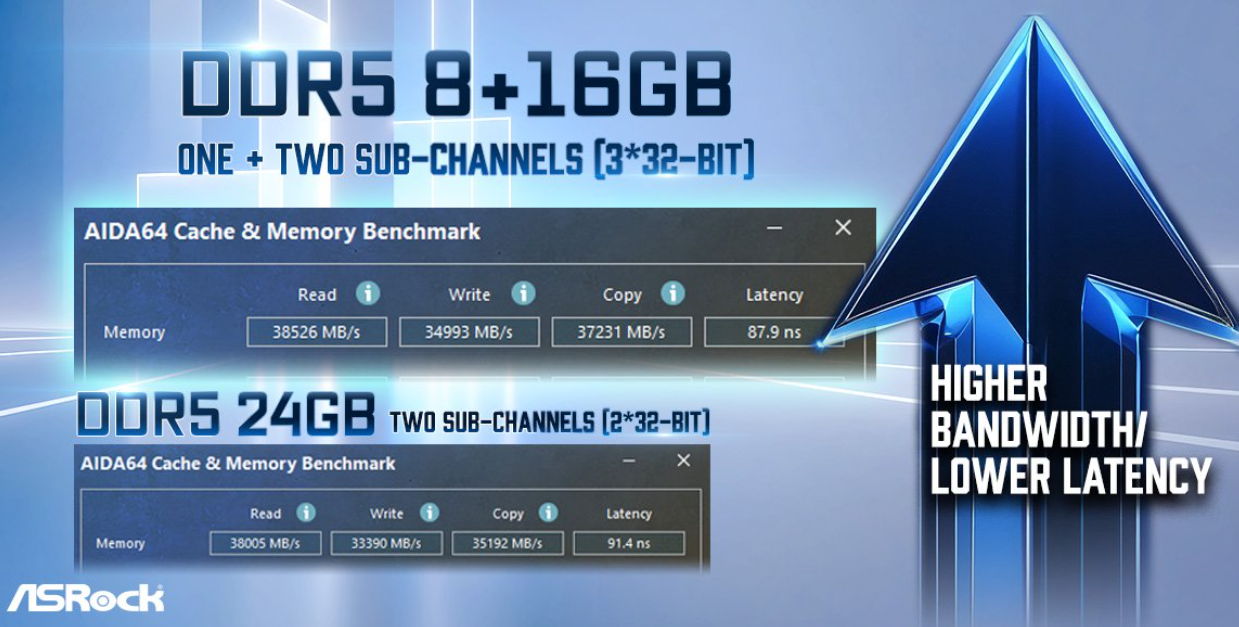 Por ejemplo, un módulo HUDIMM de 8 GB junto con un módulo UDIMM de 16 GB funcionará correctamente en modo de doble canal con al menos 3 subcanales de 32 bits activos: uno del HUDIMM y dos del UDIMM estándar. Esta configuración híbrida de 24 GB aparentemente proporciona un mayor ancho de banda que un único módulo de 24 GB con dos módulos de 32 bits, cuya fabricación sería más costosa.
