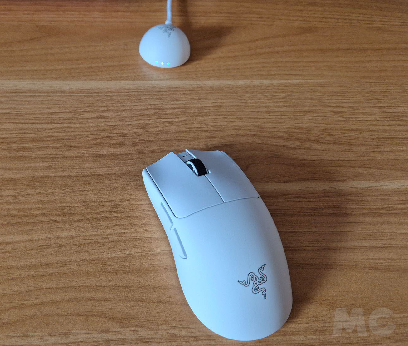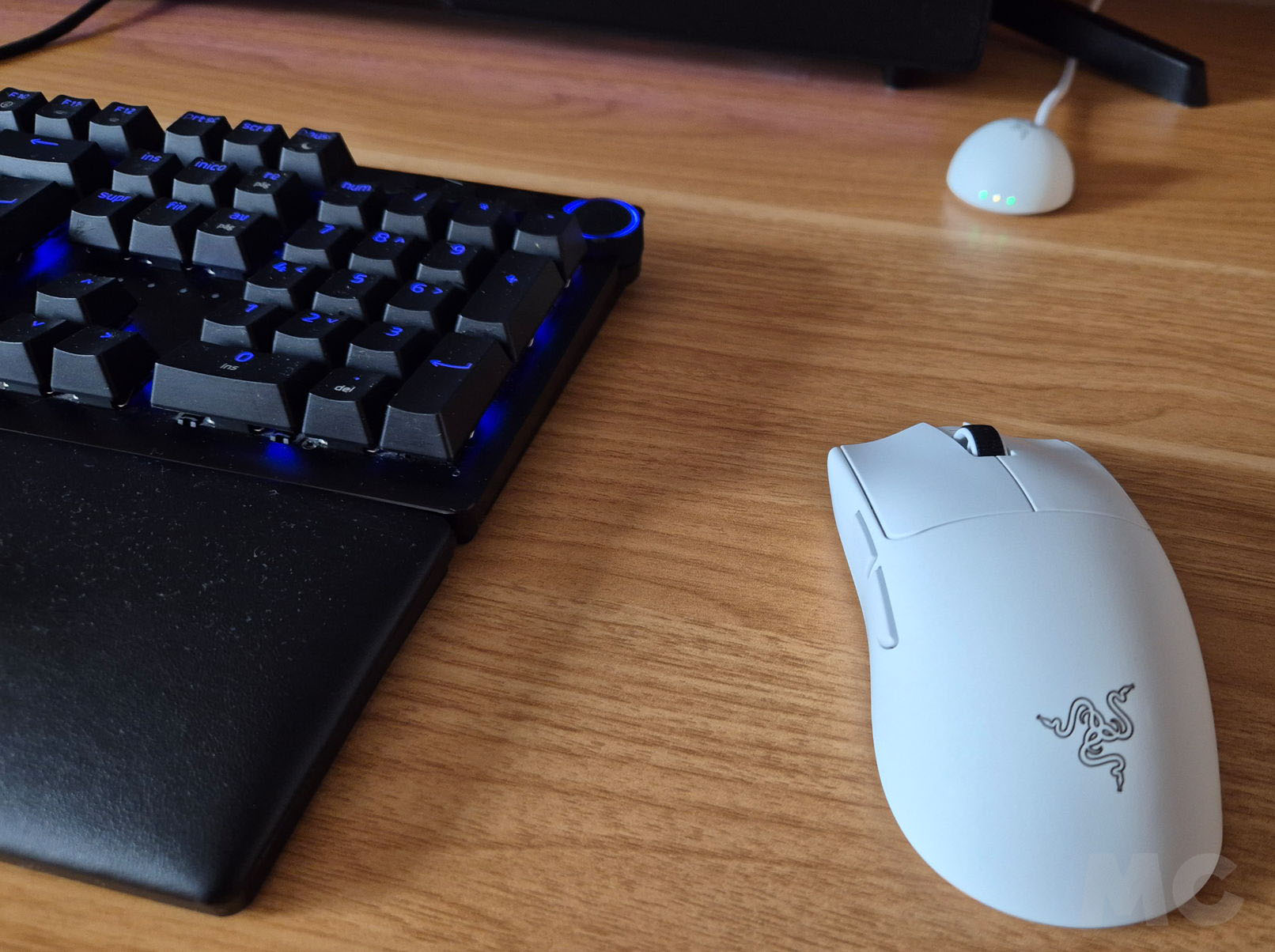 De ello se encarga el receptor incorporado y conectado por cable USB-C. Apenas ocupa sitio en el escritorio con su forma de iglú, pero ofrece más espacio para situar una antena interna más alta y mejorar el rendimiento inalámbrico. Incluye una almohadilla para evitar movimientos y tres pequeños LED forntales para indicar en tiempo real la calidad de la señal, la tasa de sondeo y la carga de la batería.