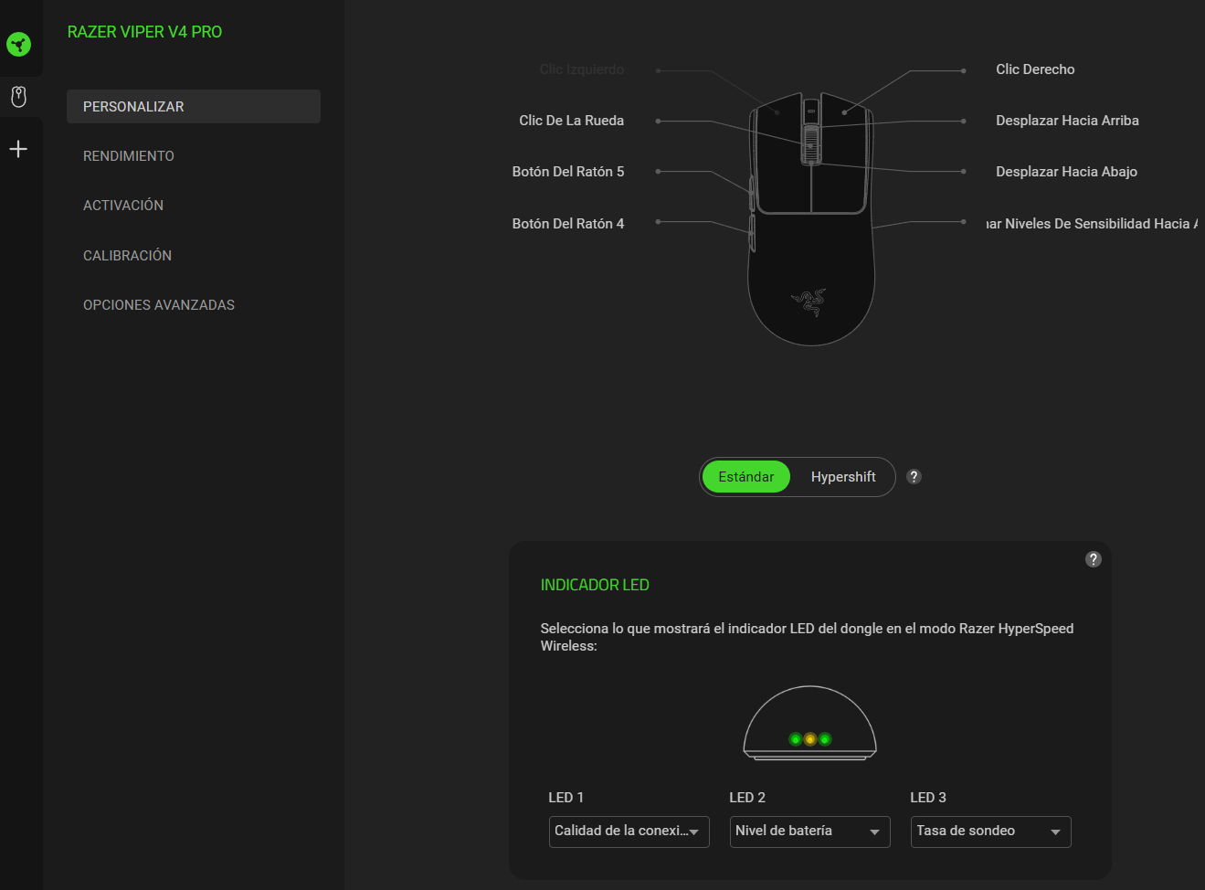 La interfaz minimalista en negro, gris y verde brillante no ha cambiado mucho con el paso del tiempo, pero en este ratón es en el caso del Razer Viper V4 Pro, es muy fácil de usar. La pestaña principal «Personalizar» es donde puedes reasignar las configuraciones de los botones y configurar Hypershift para ampliar el número de botones de 6 a 11, mediante funciones secundarias. Dispone de macros, activación de funciones de IA o configuración de las luces LED del adaptador.