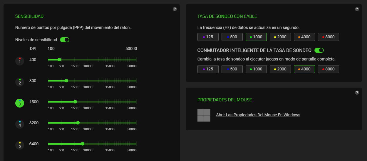También se puede ajustar la tasa de sondeo y activar el «Interruptor inteligente» que permite configurarla en 2000, 4000 u 8000 Hz al jugar, lo mismo que elegir la sensibilidad de DPI. Y si quieres más, puedes acceder a las funciones avanzadas para elegir uno de los preajustes incluidos según el juego, crear una curva de aceleración personalizada o activar la sensibilidad dinámica.